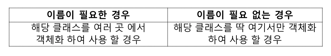 그래서 이 즉석 객체는 원본이 되는 클래스의 이름이 없다 하여 익명(anonymous) 객체라고 부릅니다.