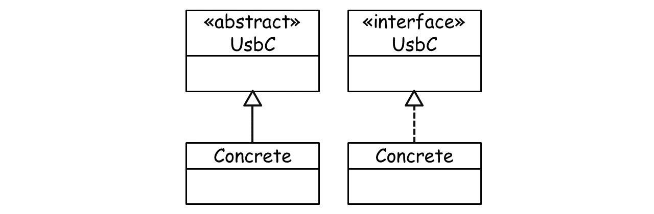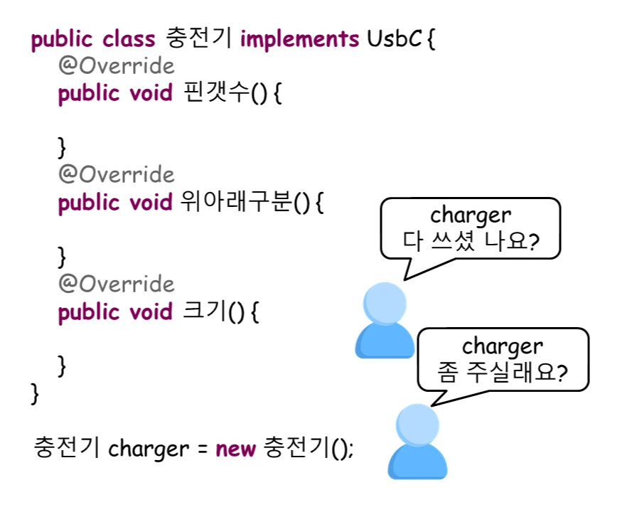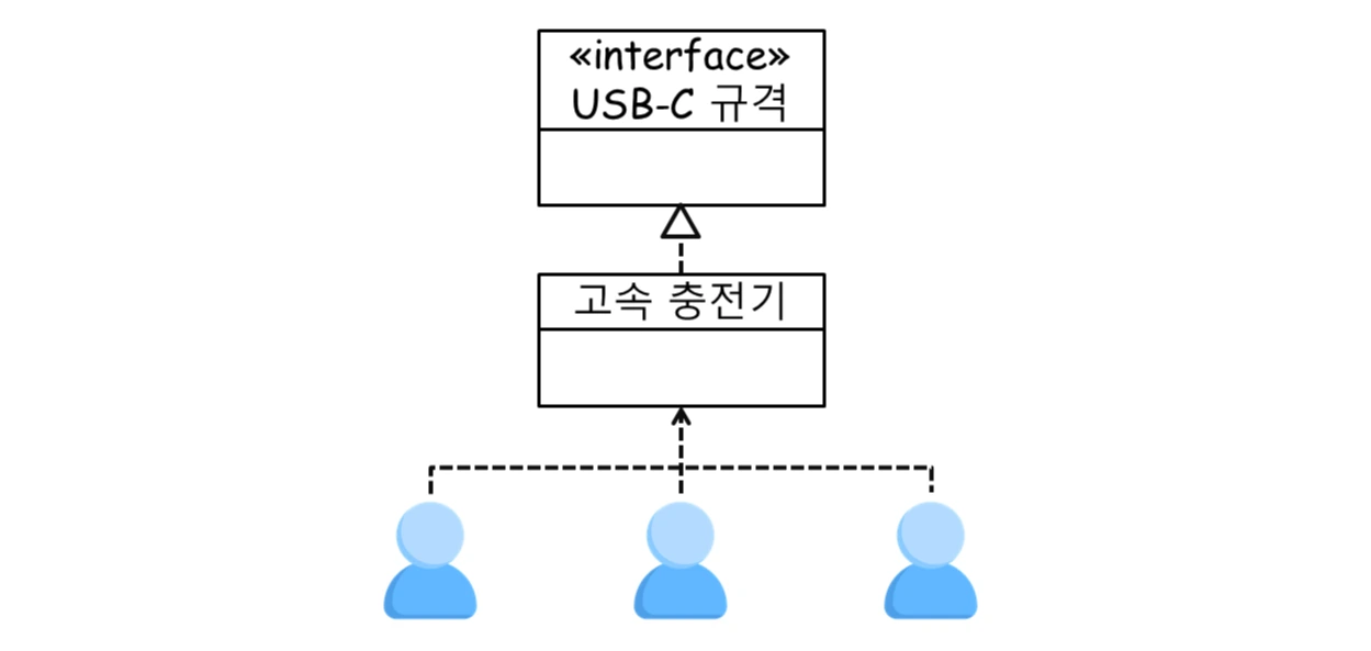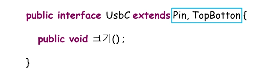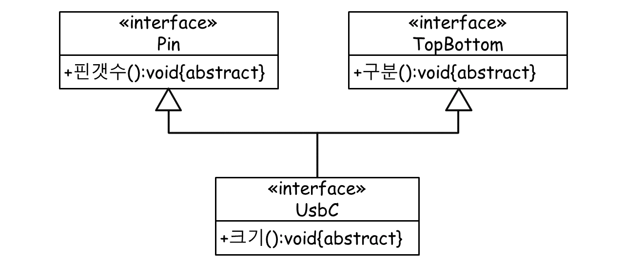 이때 다른 규격을 가진 인터페이스들을 한 번에 불러와 상속한다면 이 규격을 사용하는 사람 입장에서는 UsbC 인터페이스만 구현받으면 3가지 규격을 모두 사용할 수 있게 됩니다.