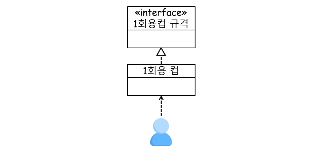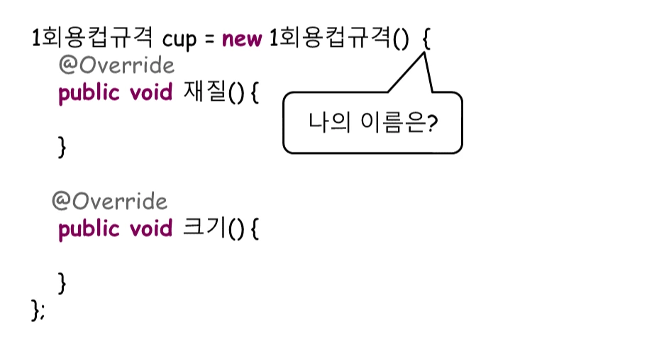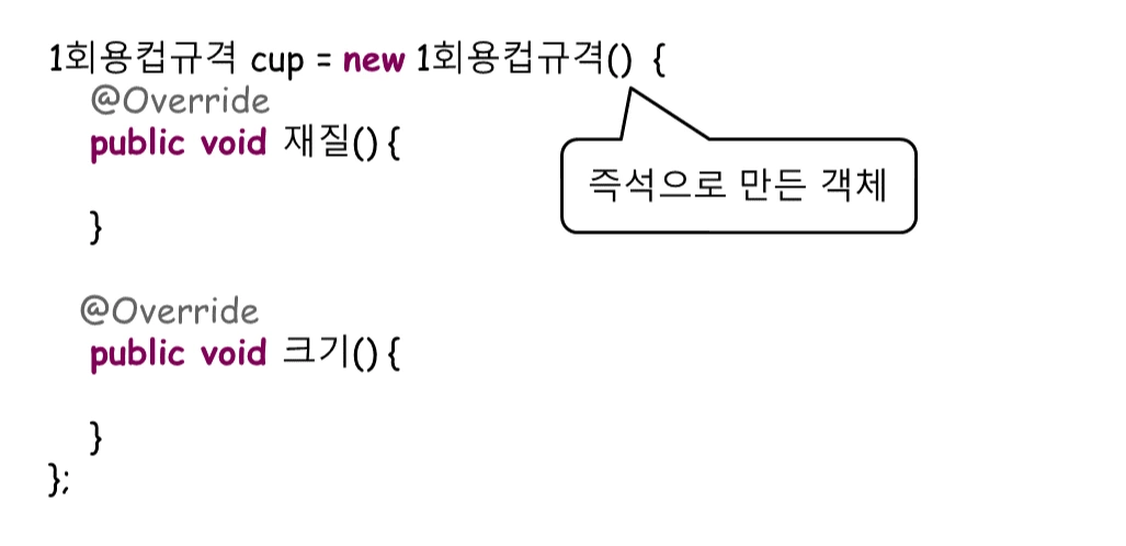 즉, 위 코드는 '1회용컵규격' 을 가지고 실체 클래스 없이 즉석 객체를 만들어 실행하라는 뜻입니다.