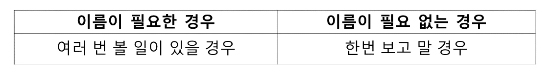 일단 우리에게 이름이 필요한 경우는 1회성이 아닌 여러 번 만나야 할 경우입니다.