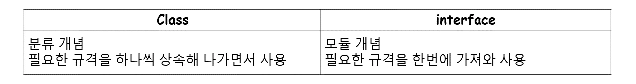 클래스는 분류의 개념이므로 필요한 규격이 여러 개일 경우 하나씩 상속을 받으며 추가해야 했다면, 인터페이스는 모듈 개념으로 필요한 규격을 한 번에 모두 가져와 사용 가능 했습니다.