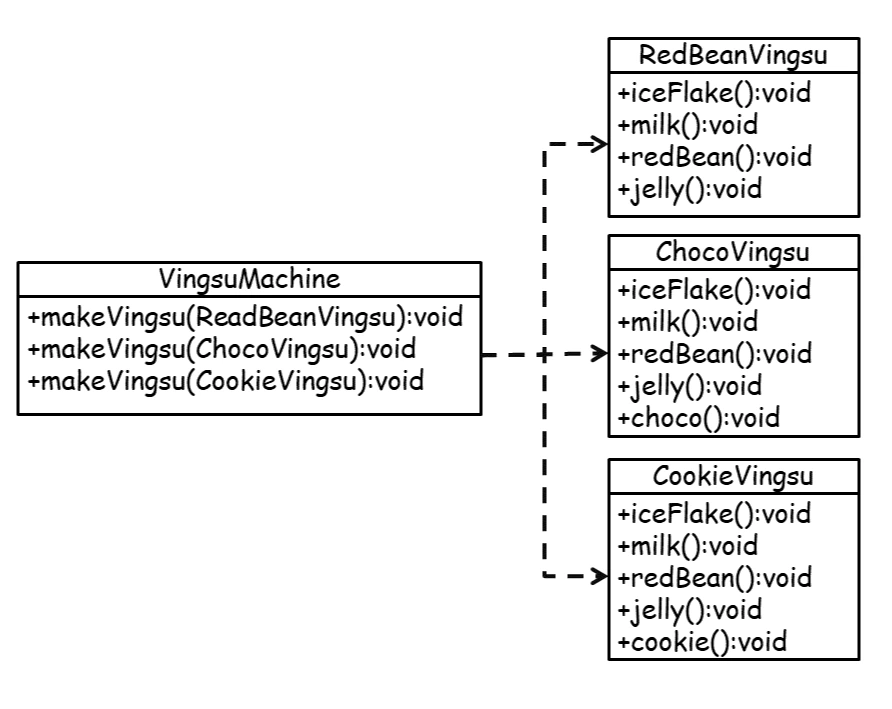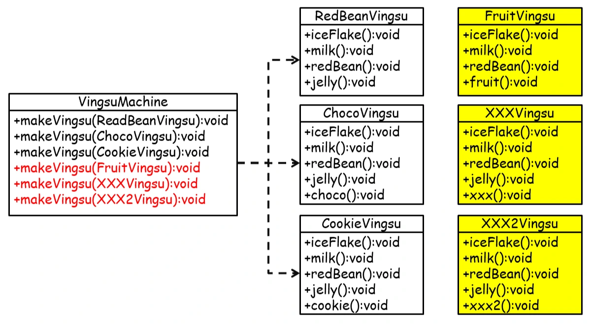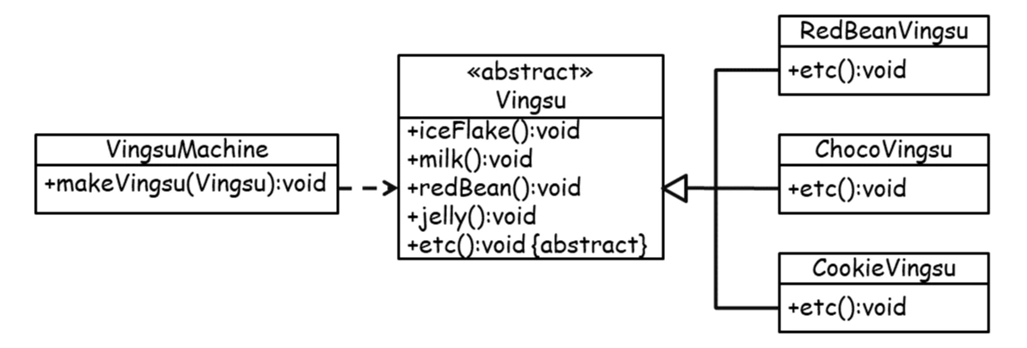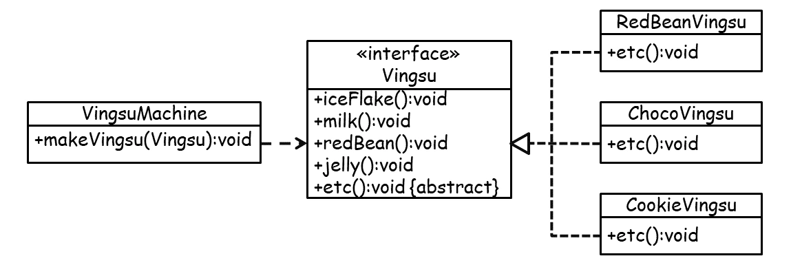 일이 굉장히 많아지겠죠? 각 빙수 클래스를 만들 때 중복코드도 많아질 분더러 VingsuMachine에 이것을 객체화하여 실행할 메서드도 늘려줘야 합니다.