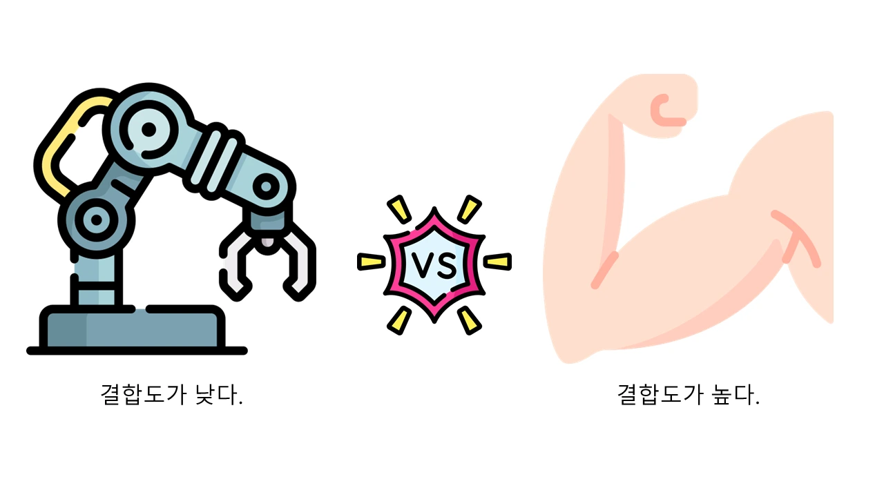 결합도가 높은 것은 사람의 신체, 그리고 낮은 것은 로봇이라고 볼 수 있겠네요.
