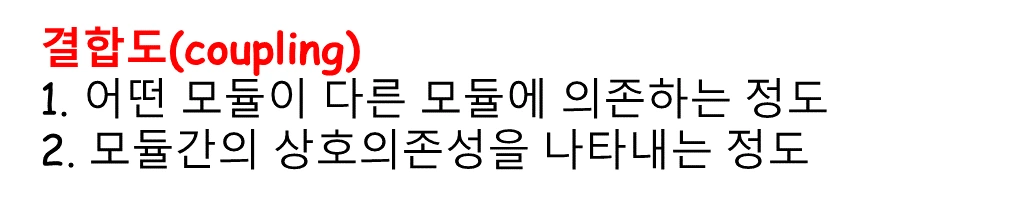 결합도란 소프트공학에서는 모듈 간의 상호 의존성을 나타내는 정도라고 표현하고 있습니다.