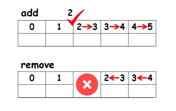 삭제 시 독특한 점이 있습니다. 추가 시 추가 위치 이후의 데이터들이 모두 한 자리씩 뒤로 물러나야 하고, 삭제 시에는 빈자리로 모두 이동해야 한다는 점입니다.