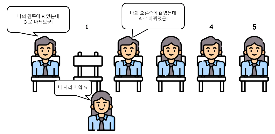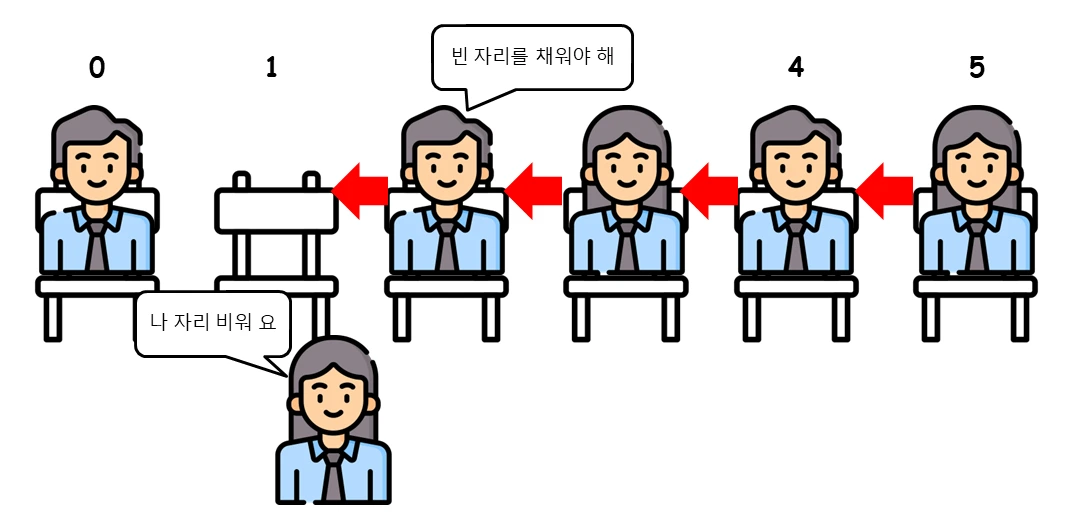 1번 자리에 있는 사람이 자리를 비우면 나머지 사람들이 빈자리를 메우기 위해서 모두 한 칸씩 이동해야 하는 상황이 생기는 것이죠! 그런데 자리를 비운 사람이 눈치 없이 1번 자리에 다시 앉겠다고 한다 면요?
