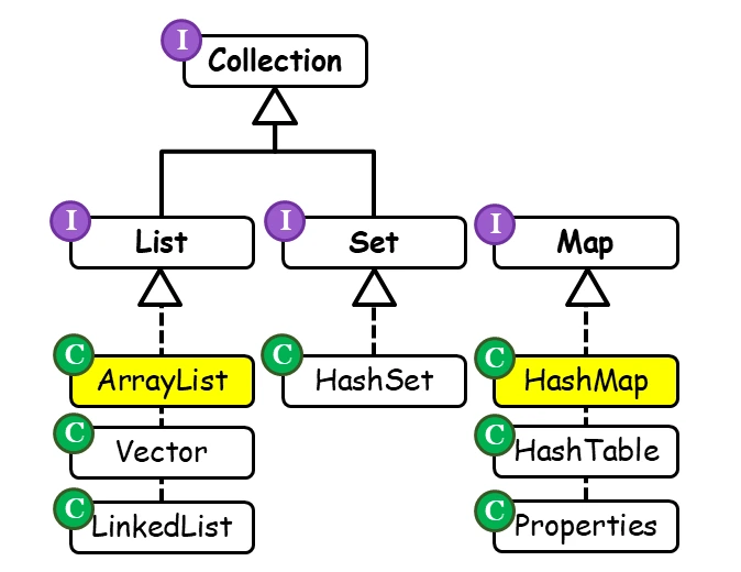 이 자료구조는 컬렉션 인터페이스를 상속받는 리스트와 셋 인터페이스, 그리고 독립적으로 맵 인터페이스가 있습니다. 그리고 각각의 인터페이스를 구현하는 클래스들이 있습니다.