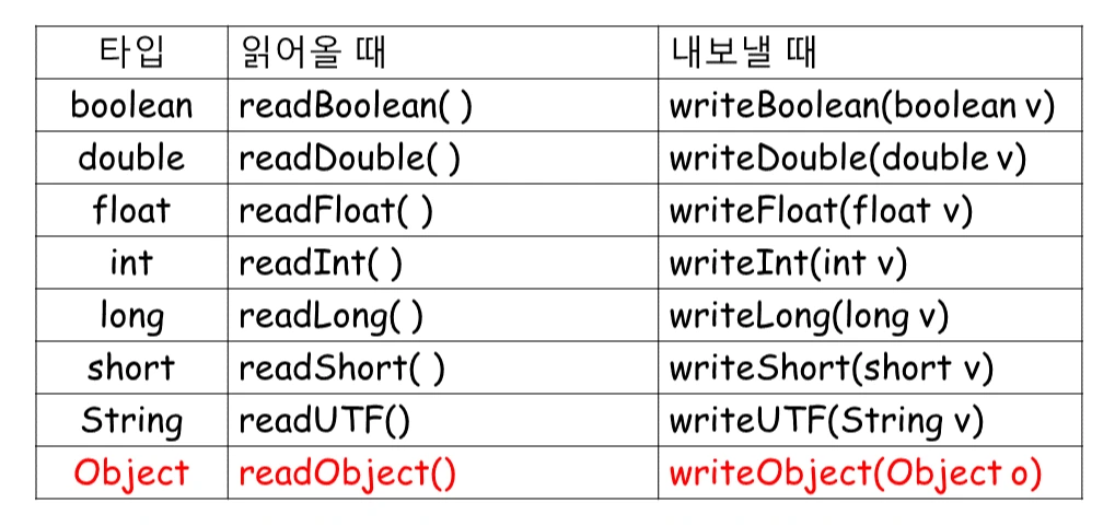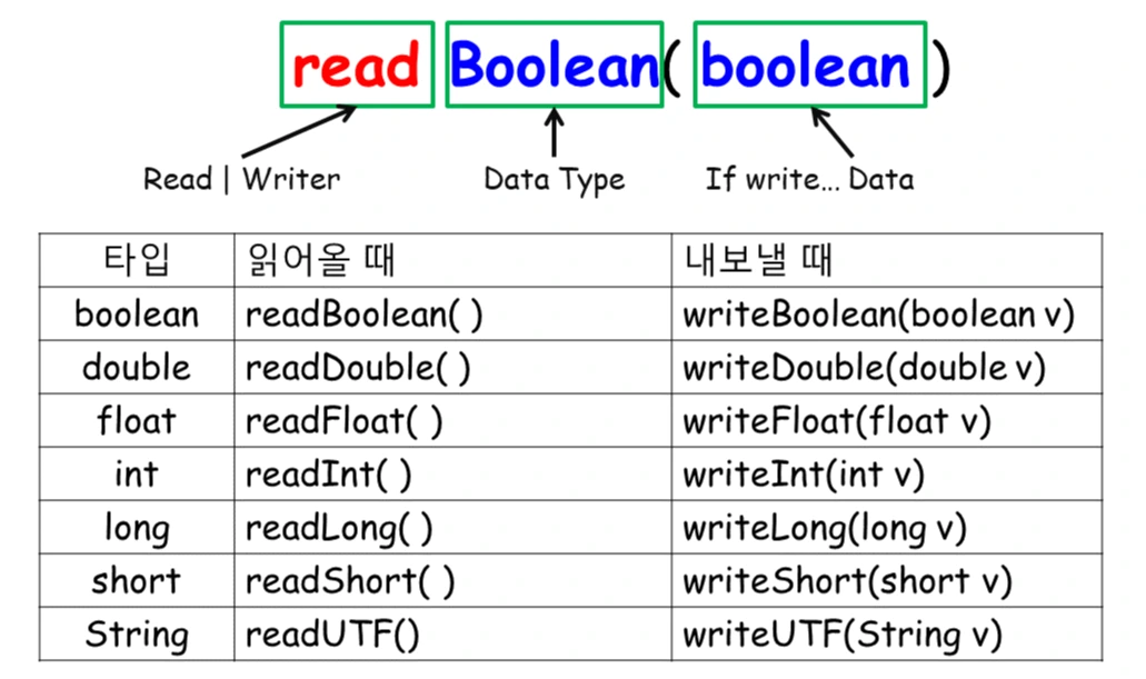 그리고 각각 특정한 데이터 타입을 쓰거나 읽기 위한 메서드를 제공합니다.