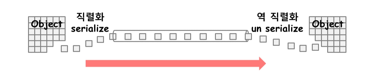 그렇기에 거대한 오브젝트를 스트림이라는 관 안에 흘려보낼 수 있도록 잘게 잘라주는 직렬화(serialize), 그리고 이렇게 잘린 조각들을 다시 오브젝트 형태로 맞추는 역직렬화(un serialize)를 사용해 오브젝트를 이동시켜야 합니다.