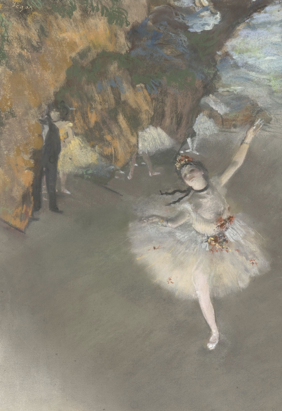 드가의 유명한 그림 스타입니다. 제목처럼 공연을 하는 그녀에게서는 빛이 납니다. 그런데 어딘가 이 그림 무섭다는 느낌이 듭니다. 얼굴이 일그러져 표정이 보이지 않습니다. 뭔가 고통에 가득 찬 것 같기도 하고 환희에 기뻐하는 것 같기도 한 그림입니다.