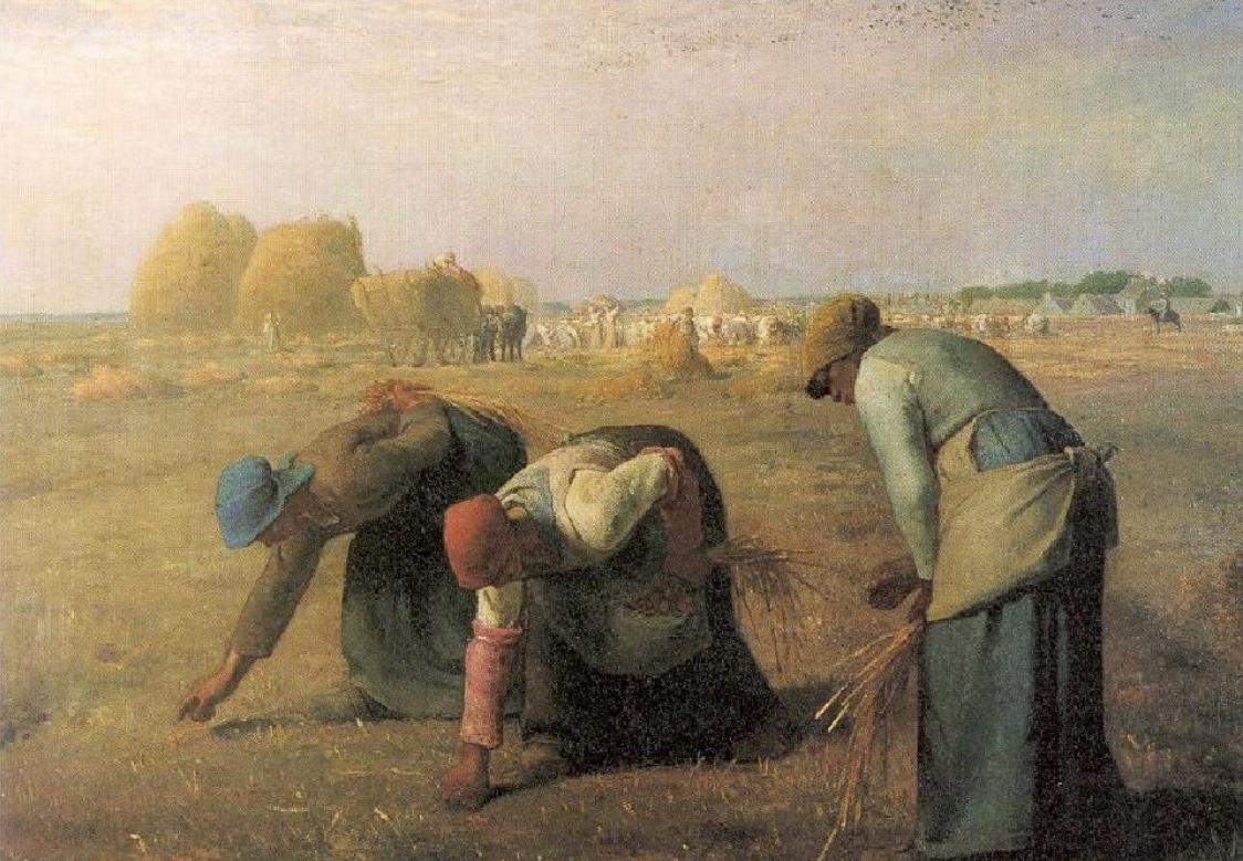 광고에서 책에서 교과서에서 한 번쯤은 본 그림일 것 같은데요. 황금빛 들판에서 이삭을 줍는 여인들이 보입니다. 이 여인들 뒤로 꽤나 많은 양의 추수된 곡식들이 있는데요. 언뜻 보면 그냥 추수를 하는 사람들의 모습이며 별 특징 없어 보이는 그림입니다.