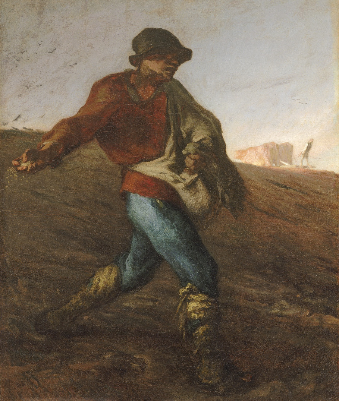밀레의 씨뿌리는 사람입니다. 씨를 뿌리는 단순한 모습이지만 당당합니다. 영웅만큼이나 위풍당당한 포즈로 씨를 뿌리고 있습니다. 이 자리에 작고 초라한 농부의 자리는 없습니다. 자신의 일에 최선을 다하는 빛나는 사람만이 존재할 뿐입니다.