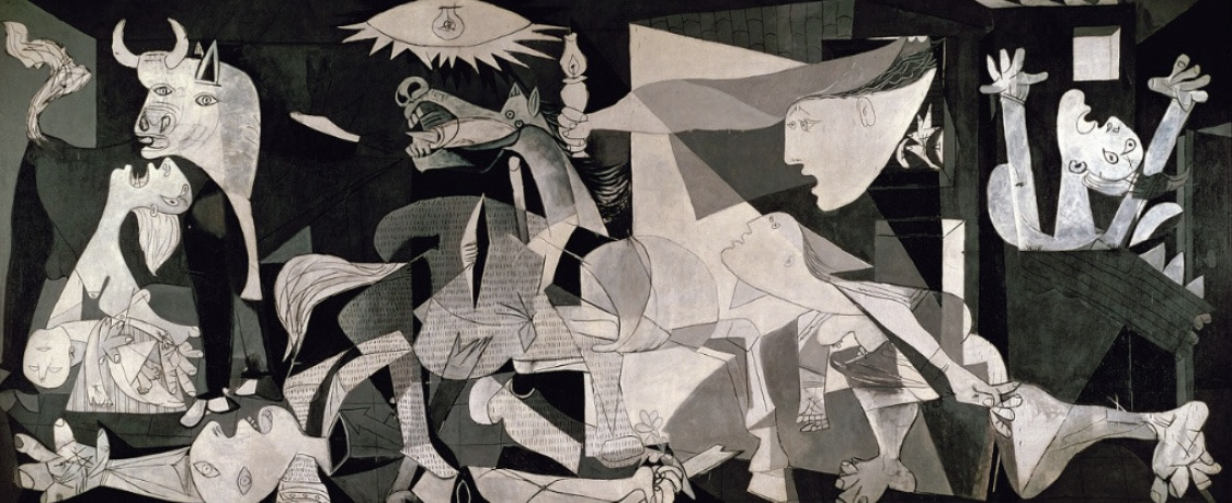 그림의 이해를 위해 간단히 설명하자만, 당시 내전 중이던 스페인의 세력이 독일 나치군과 손잡고, 상대방 쪽의 세력을 위협하기 위해서 스페인의 게르니카 지역을 비행기로 폭격했답니다. 이 사건으로 1600여 명 이상이 사망하거나 희생되었고 이 사람들 중 대부분은 민간인이었습니다. 이 게르니카 폭격 사건을 전해 들은 피카소는 전쟁과 폭력의 참상을 고발하고 반대하는 그림을 그리는데요. 이 그림이 바로 게르니카입니다.