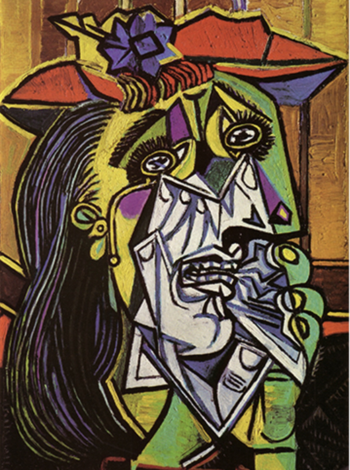 생각하는 미술의 세계에서는 그녀의 모습 중 앞모습과 뒷모습 그리고 옆모습을 모두 하나로 합쳐서 한 캔버스 안에 그립니다. 그래서 우는 그녀의 모습을 입체적으로 보여줍니다. 그래서 이 그림은 사실적입니다. 실물과 똑같이 그린 그림은 아니지만, 그녀의 울음을 입체적으로 표현합니다.