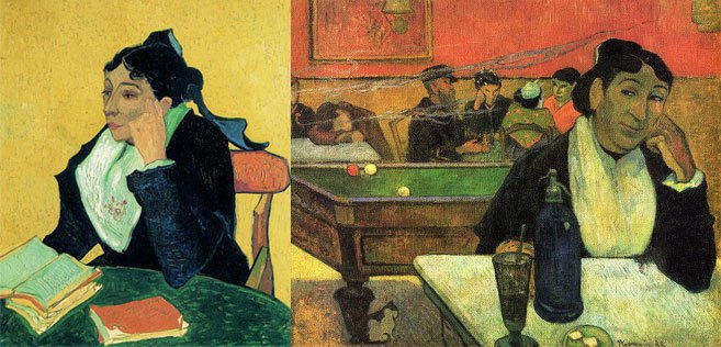 더욱이 고갱과 고흐가 함께 그린 마담 지누의 그림은 그들의 관계와 성향에 대해 다시 한번 보여 줍니다. 같은 포즈, 같은 옷, 같은 사람을 그린 두 사람의 시각은 매우 다릅니다. 고흐가 그린 마담 지누는 책을 읽고 있는 눈매가 날렵하고 총명해 보이는 여인입니다. 반면에 고갱이 그린 마담은 술을 파는 곳의 마담으로 동그란 얼굴에는 경멸의 미소가 담겨 있습니다. 고흐가 좋은 이웃으로 생각하는 이를 술을 파는 곳의 마담으로 그린 고갱 , 그가 그린 마담의 경멸은 고흐를 향한 것인 아닐까 하고 생각됩니다.
