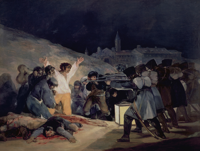 그의 그림 <마드리드, 1808년 5월 3일>는 프랑스 군이 스페인의 민간인을 학살하고 있는 장면을 그린 그림이랍니다. 엄청난 숫자의 스페인 민간인을 학살한 이 사건은 고야의 스케치 위에서 다시 재현됩니다.