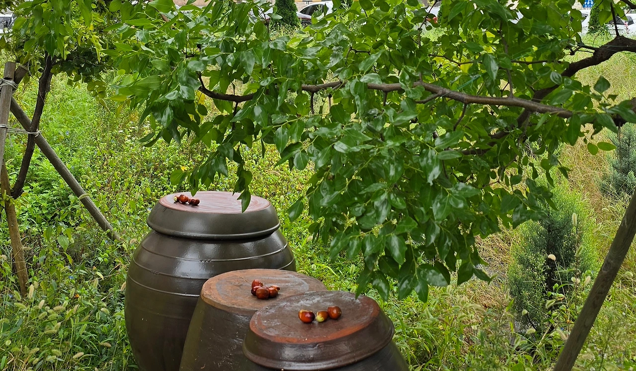 요양원 옆 치유정원 장독대 옆에는 대추나무 두 그루가 나란히 서 있습니다. 오늘은 가을빛에 여물어가는 붉은 대추를 수확하는 날이었지요. 언뜻 성글게 보이던 열매였는데, 사다리를 타고 올라가 하나둘 따다 보니 어느새 바구니 두 개가 그득해졌습니다.