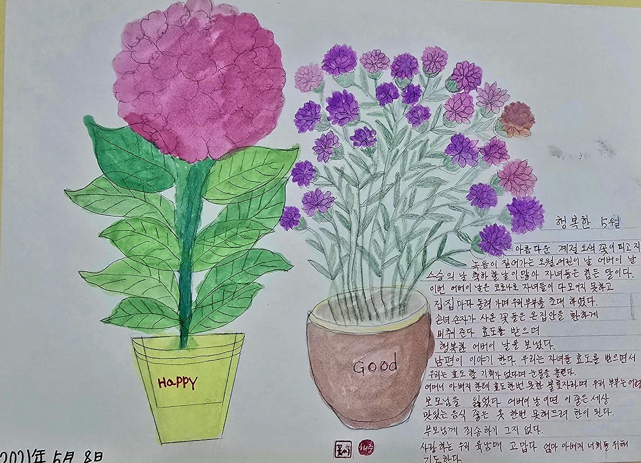 요즘도 엄마는 작은 병실 테이블 위에 색연필을 펼쳐놓고 그림을 그린다. 아버지와 함께했던 가을 산책길, 형부가 사다 준 작은 화분 하나, 소담하게 담긴 홍시 몇 개. 그림 속엔 늘 삶의 따뜻한 조각들이 담긴다. 그렇게 완성된 그림들은 하나둘 병실 벽에 걸렸다. 삭막한 병실에는 정말 엄마와 아버지의 삶과 이야기가 꽃이 되어 피어나는 것 같았다.
