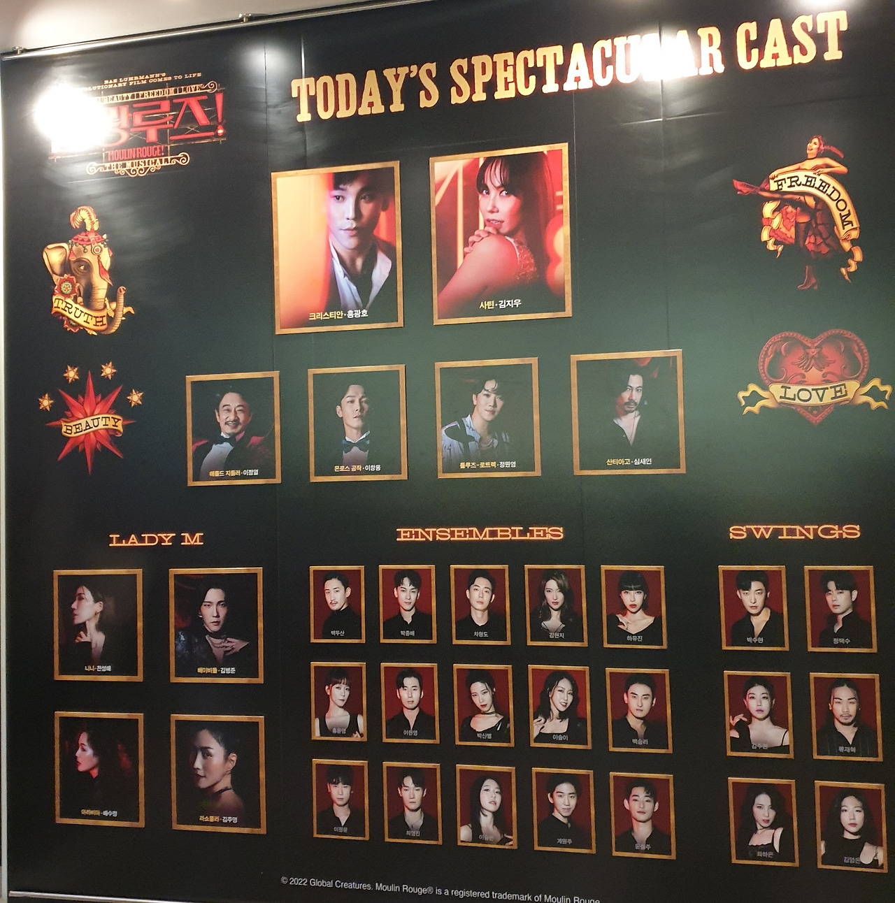 아시아 초연에 아직은 낯선 (잘 안 들리는) 번역 가사가 과제로 보인다. 그러나 끝내주게 화려한 무대와 조명으로 입이 떡 벌어지는 쇼를 보고 싶다면 망설일 것도 없이 '물랑루즈!' 안으로 들어가길 추천한다.