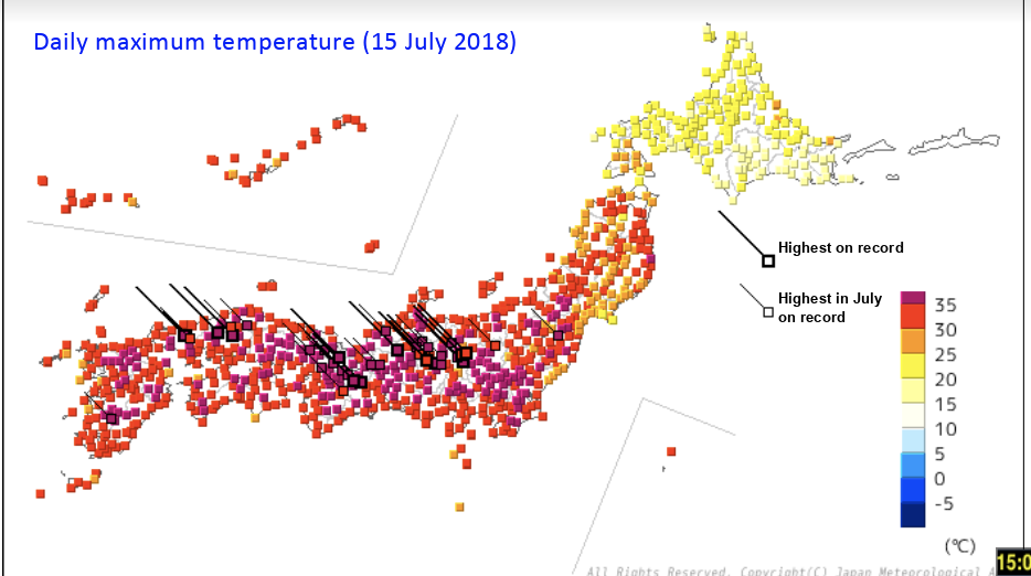 유럽뿐 아니라 아시아도 폭염과 폭우로 고통받고 있습니다. 우리나라도 최근 35도를 웃도는 기록적 폭염이 계속되고 있습니다. 순간 최고기온이 40도를 넘어서기도 했습니다. 일본은 더 심각합니다. 일본 기상청 데이터를 보면 7월 15일 전체 927개 중 200개 관측소에서 35도가 넘는 최고 기온을 기록했습니다. 일본 기상청은 8월 2일까지 매우 높은 기온이 지속될 것이라고 경고했습니다. 도쿄 근처에 있는 쿠마가야는 41.1도를 기록했습니다.