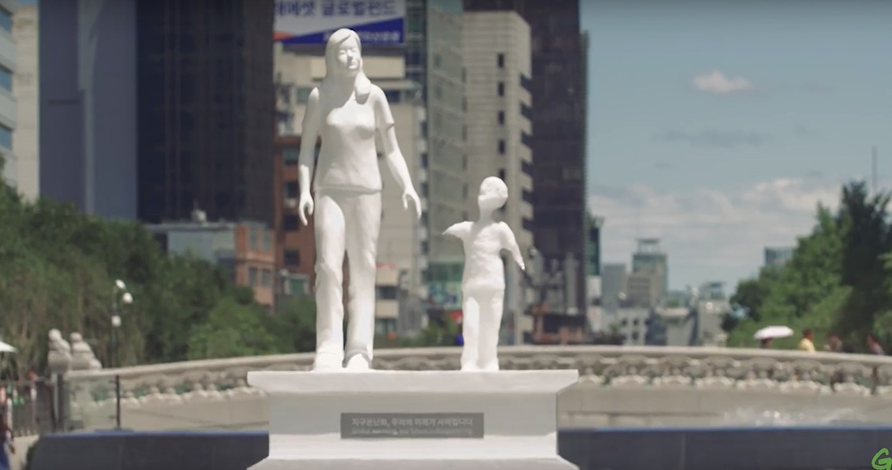 지난 6월과 7월 청계천 광통교 위에서 있었던 일입니다. 석고상으로 만든 엄마와 얼음으로 조각한 아이가 더운 기온에 녹아 사라지는 장면을 카메라에 담았습니다. 그린피스는 이 영상을 통해 “기후변화가 현실의 문제이며 우리 아이의 미래를 위협하고 있다”는 경고의 메시지를 전달하고 싶었다고 전했습니다.