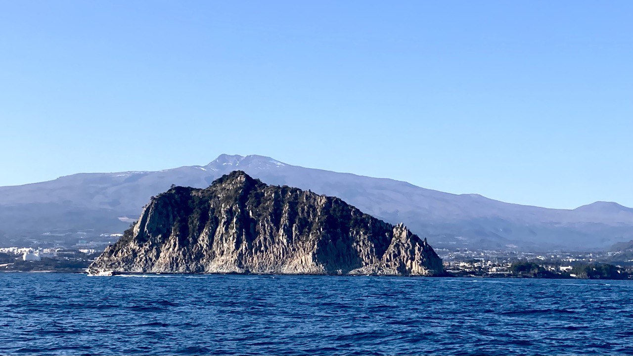 남쪽바다에서 본 서귀포 섶섬과 한라산