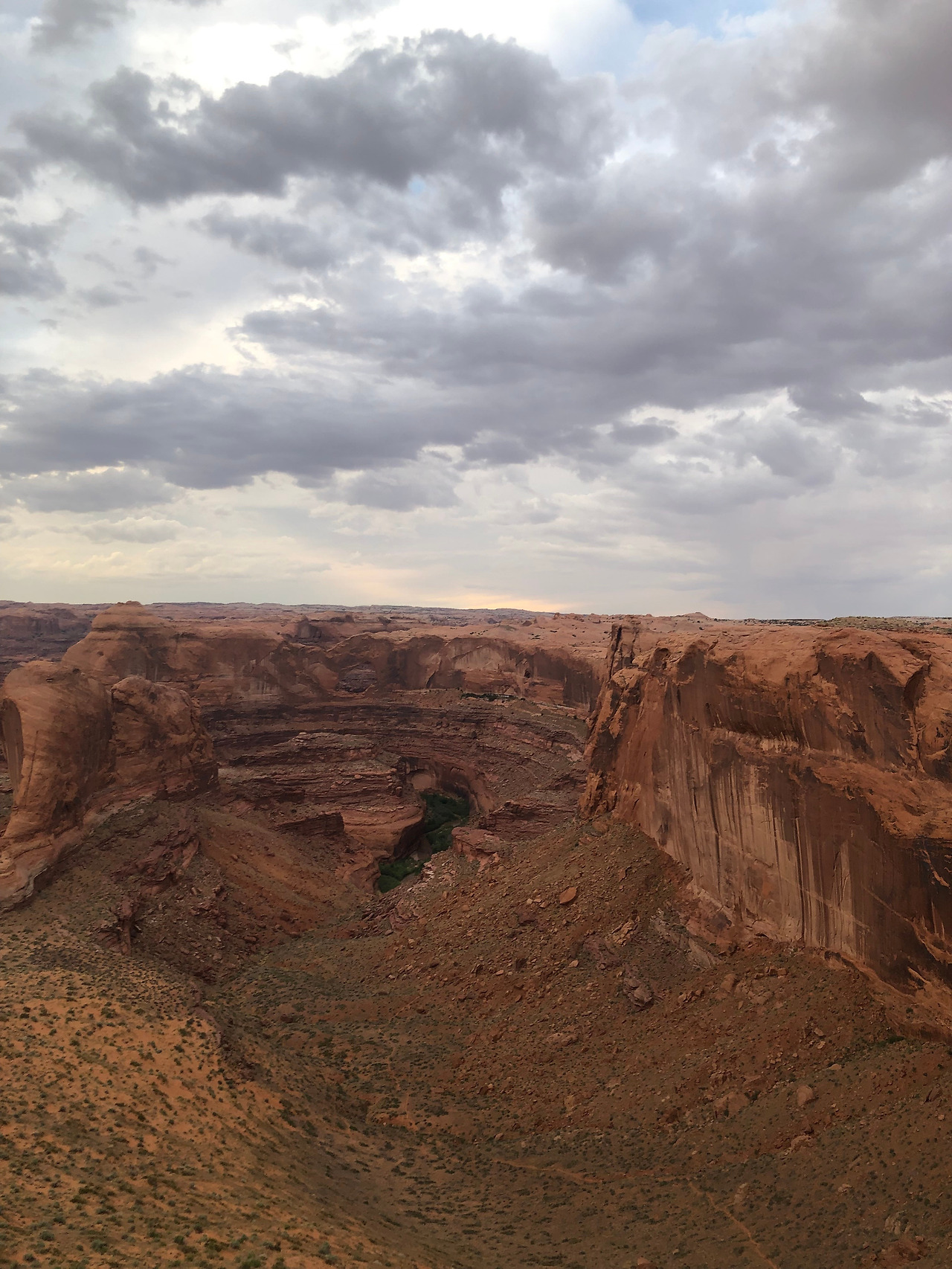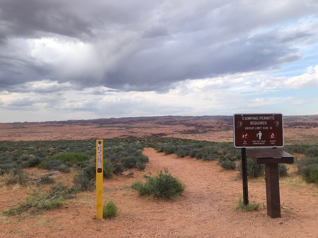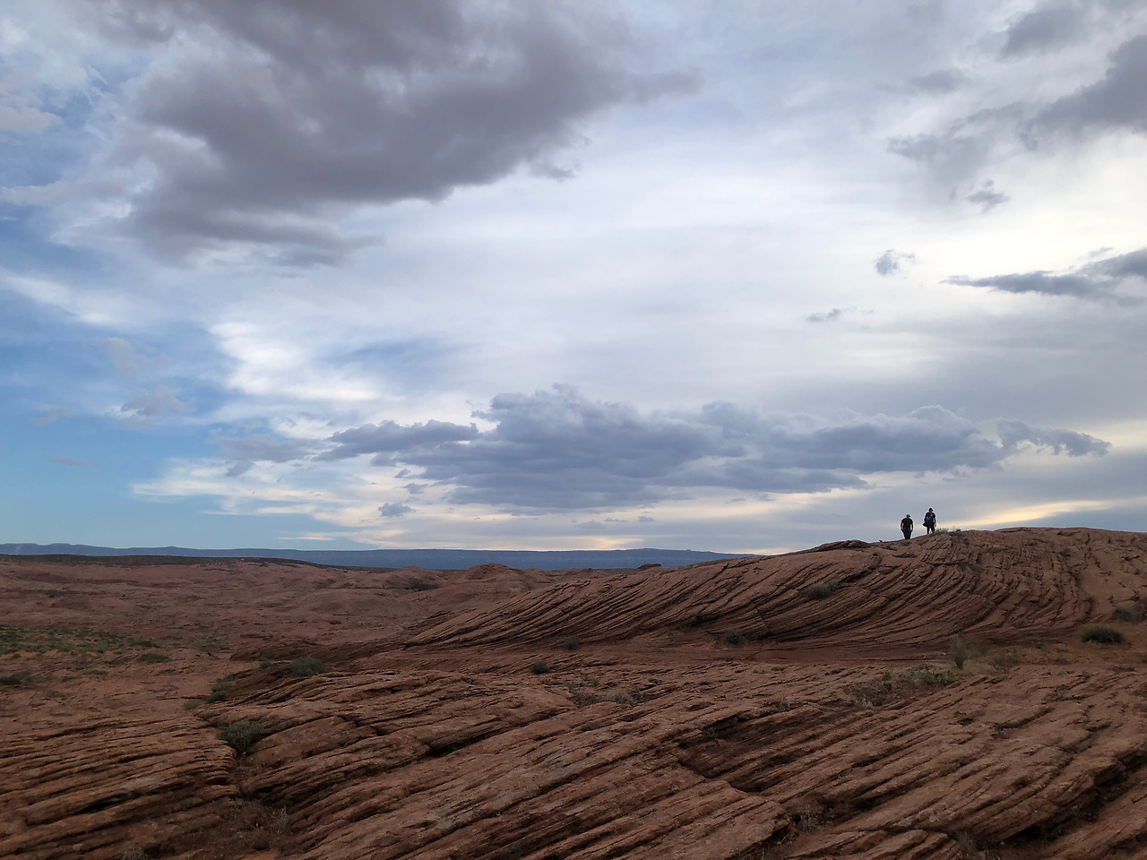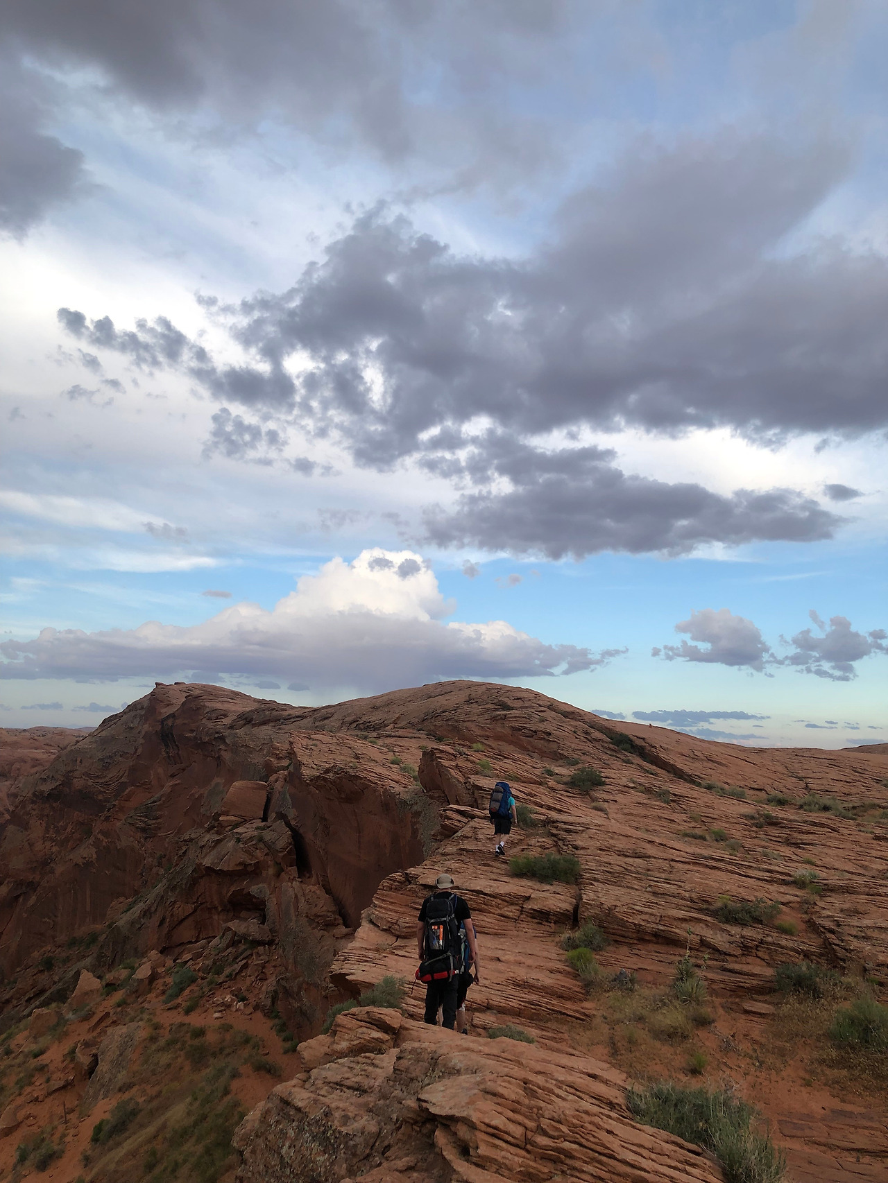 우리는 주차를 오후 7시쯤 했다. 해가 완전히 떨어지기까지 2시간 30분 정도 남은 시간이었다. 다소 늦은 시간에 서둘러서 협곡으로 향했다. 협곡으로 내려가기 위해서는 모래길과 암석 길을 약 1시간 정도 걸어야 한다. 사실 말이 길이지 눈에 띄는 트레일이 존재하는 것은 아니다. 모래길에서는 이전에 걸어간 사람들의 발자국을 보고 따라갈 수 있지만 암석으로 바닥이 변하면 트레일이 아예 사라진다고 해도 무방하다. 모래길을 걷는 것은 정말이지 지옥이다. 발이 푹 빠지는 모래길, 그나마 내려가거나 평지여서 다행이었다. 또 날씨도 얕은 비가 내렸다가 혹은 비가 그치면 구름이 많은 상태로 유지되어서 강렬한 태양빛 없이 걸을 수 있었다.
