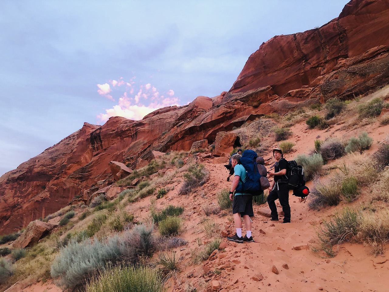 석양과 함께 보이는 협곡의 어마어마함은 그 어느 협곡과 견줘도 무리가 없을 것 같다. 이렇게 협곡의 절벽을 따라서 걷고 걷다 보면 그나마 사람이 내려갈만하지 않을까 하는 절벽이 나온다. 우리 넷은 로프를 이용하여 조심스럽게 짐을 내리고, 사람이 내려가고, 또 사람이 내려가면 짐 먼저 받아주고, 서로를 도와주고 하면서 이 절벽을 조금씩 내려가게 된다. 절벽을 내려가면 엄청난 모래 언덕이다. 다행히 거의 다 내리막길이다. 절벽 위에서 아래 계곡으로 내려가는 길이다 보니 부담 없이 내려갈 수 있었다.