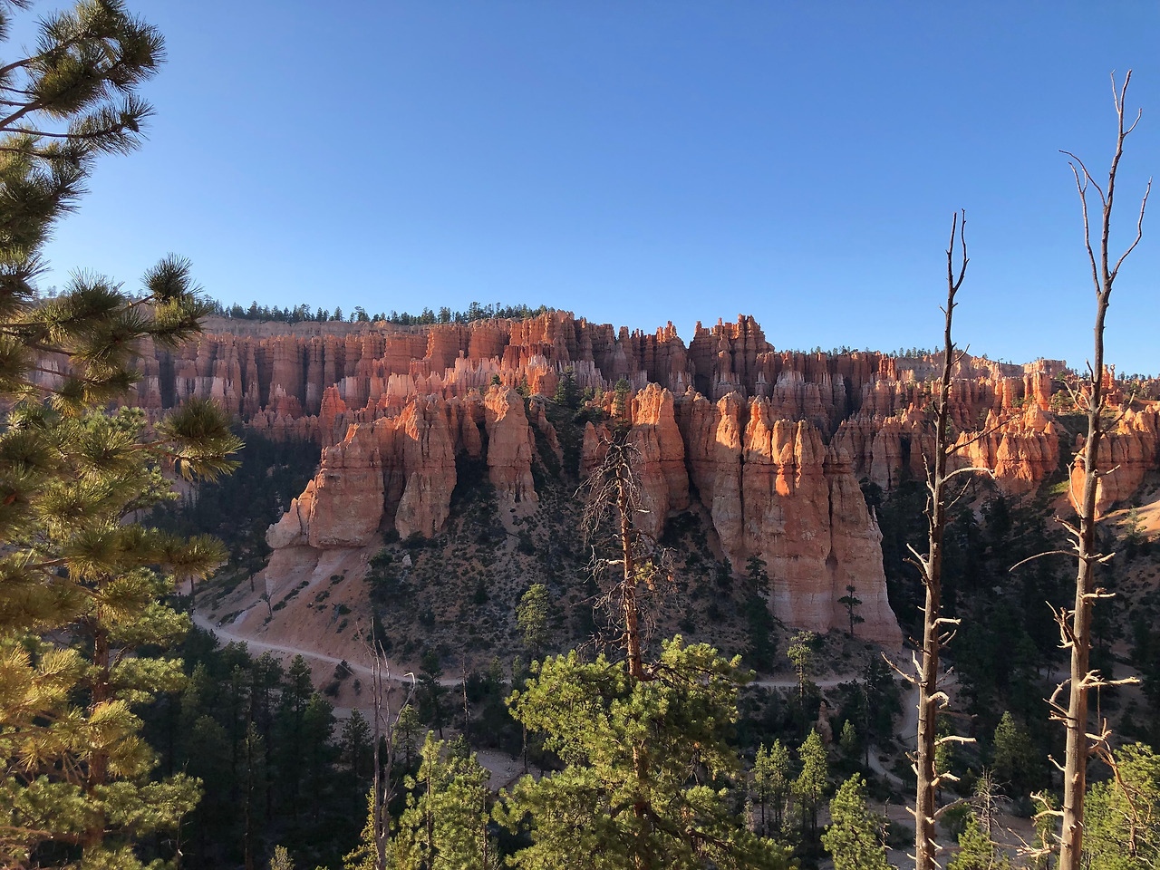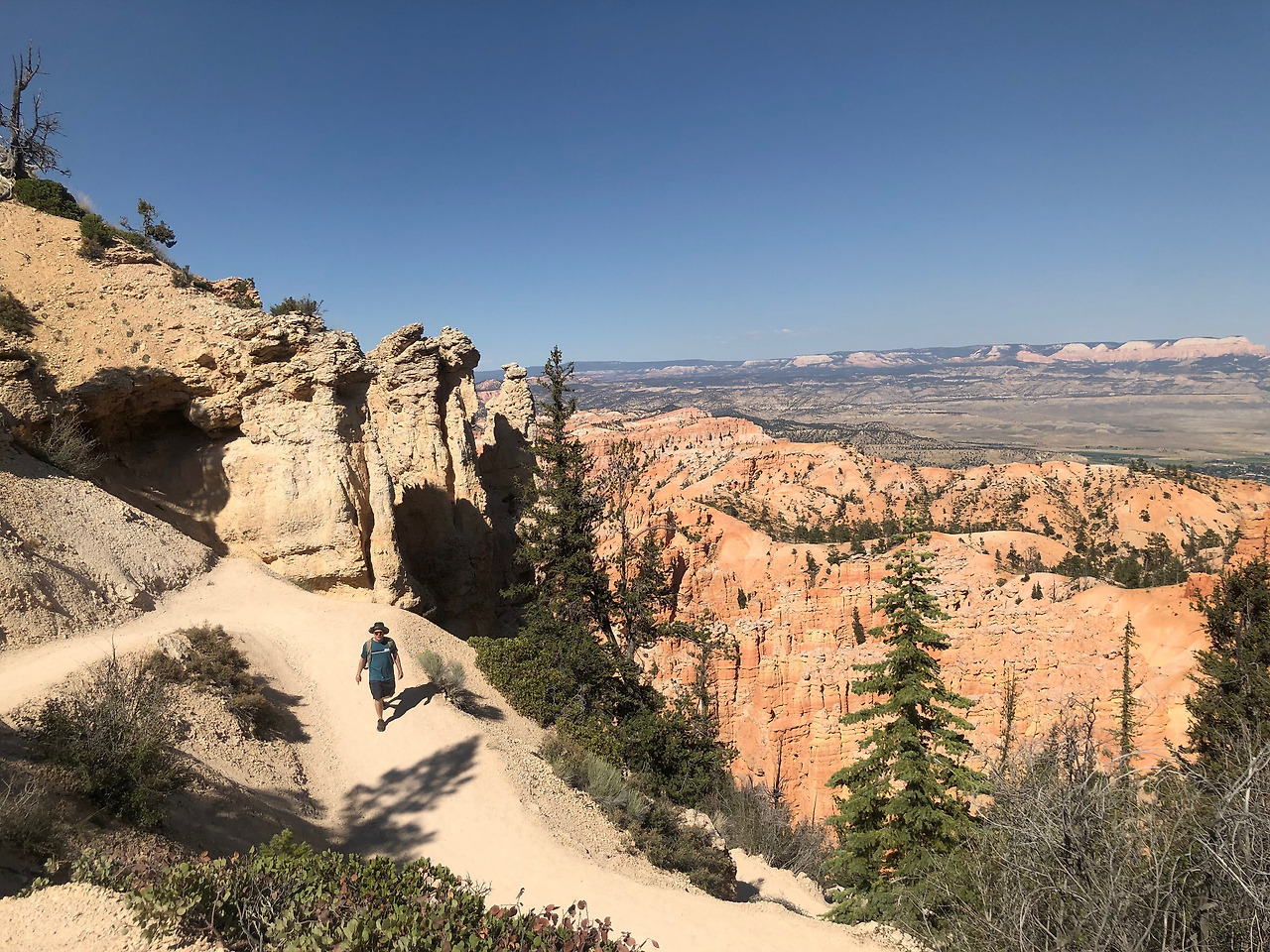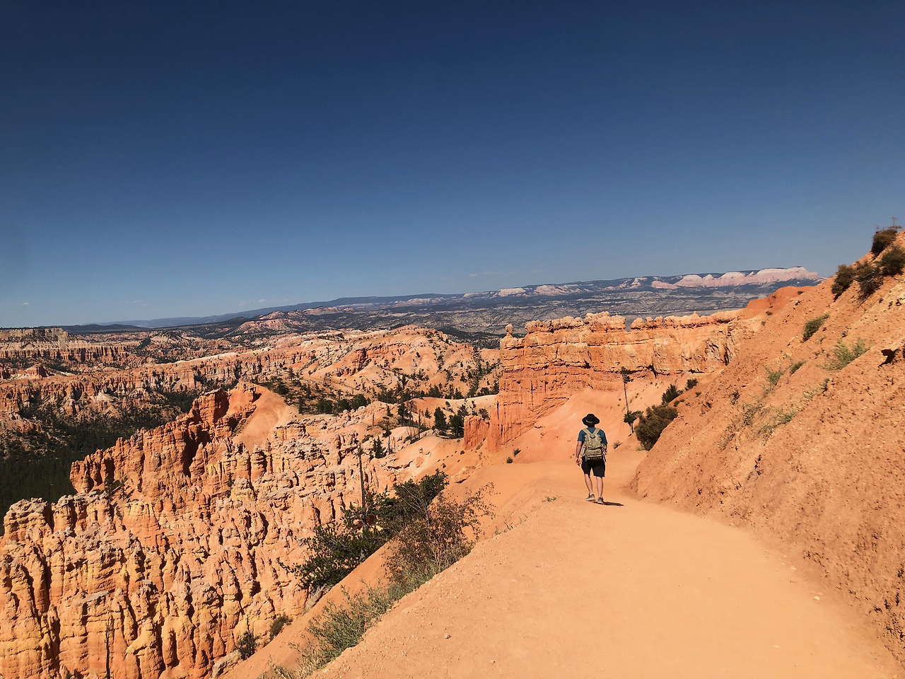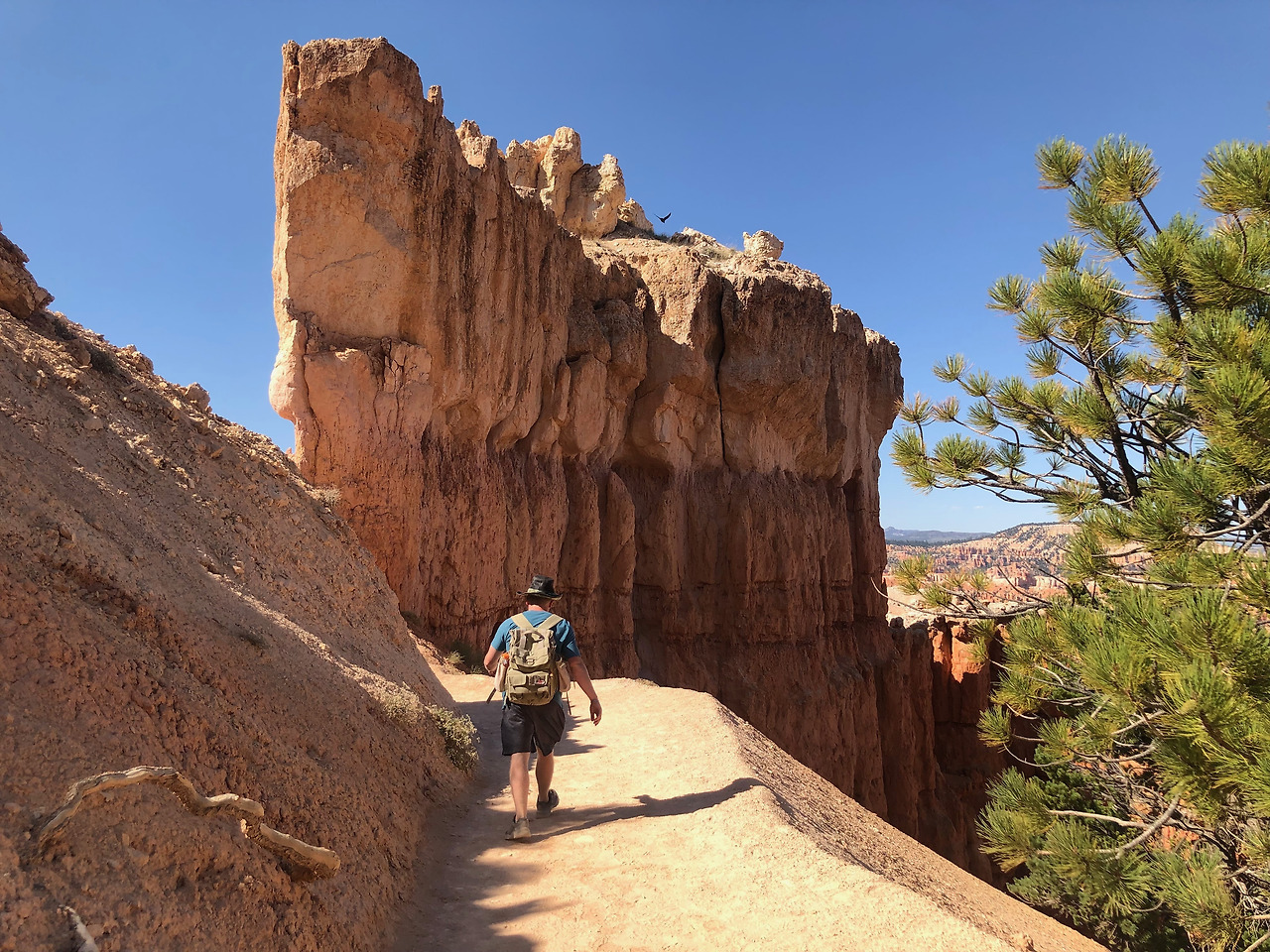 하이킹의 시작은 내리막길로 시작한다. 서서히 지그재그를 그리며 후두스 곁으로 다가가게 된다. 높은 곳에서 낮은 곳으로 내려가는 길로 시작하다 보니 그 경치는 당연히 말할 것도 없다. 사람들이 바글바글 했던 뷰 포인트에서 한적한 길을 내려가며 바라보는 풍경은 더욱더 브라이스 캐년을 즐길 수 있도록 만들어 주었다. 우리가 선택한 트레일은 Pick a boo trail 이였는데 루프 형식의 트레일이라 다시 제자리로 돌아올 수 있는 트레일이다. 큰 후두스를 옆구리에 끼고 걷는 이 기분은 하이킹의 설렘을 더 했다. 요리 조리고 구불구불 나있는 예쁜 길도 그