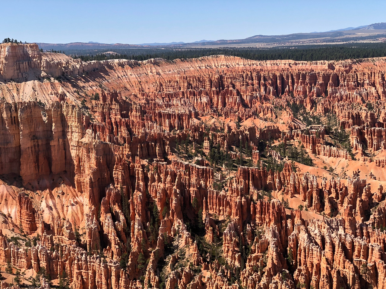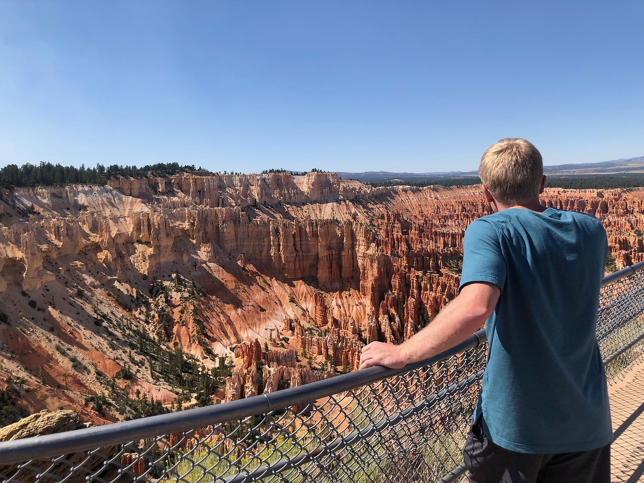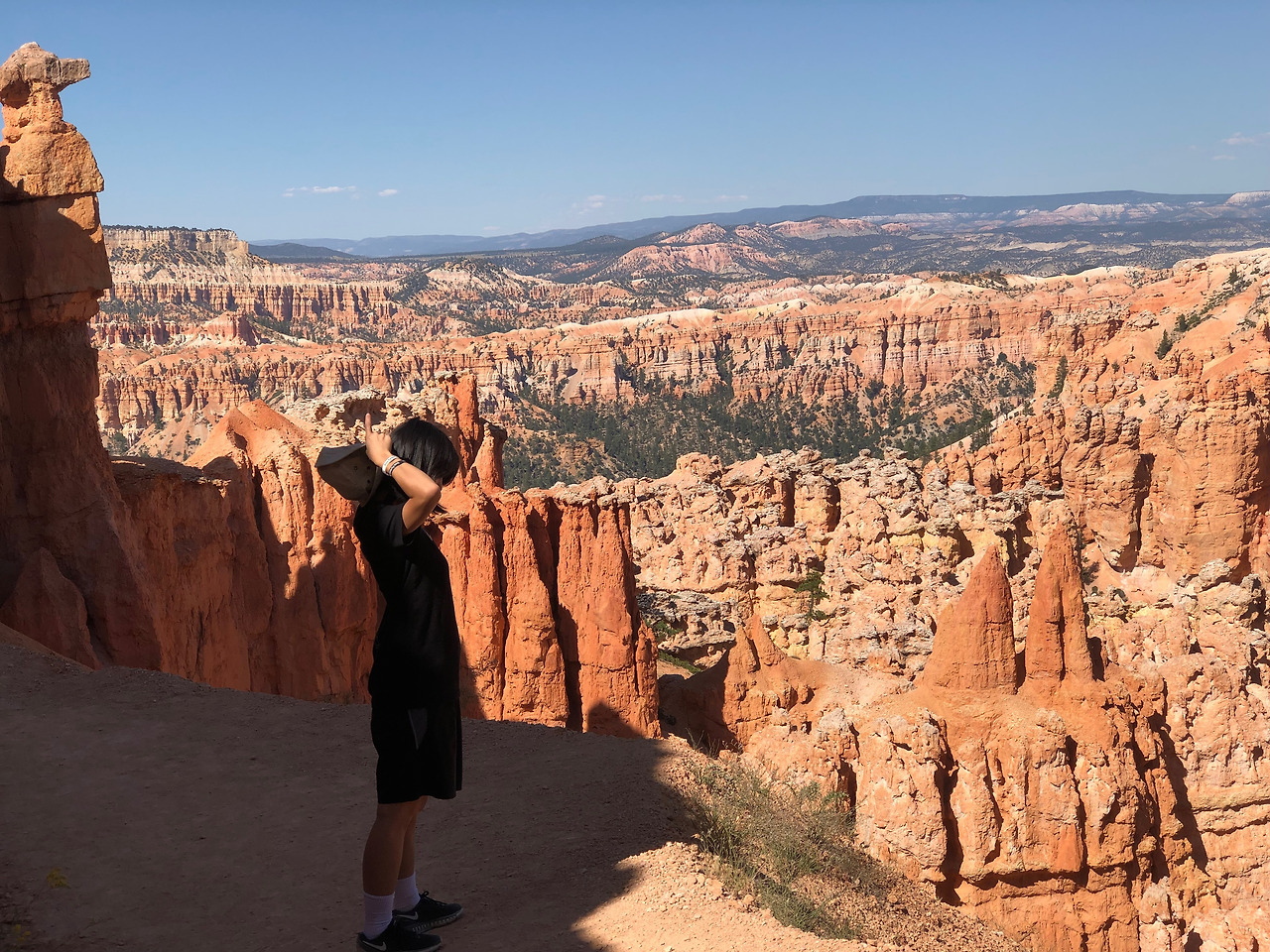 가장 많은 관광객들이 즐비해 있는 곳은 당연히 브라이스 캐년을 한눈에 담아 볼 수 있는 여러 곳의 view point 들이다. 우리가 간 view point는 Bryce point. 후두스가 끝없이 펼쳐진 모습을 한눈에 담을 수 있는 곳이었다. 난간을 사이에 두고 보이는 그 장관은 절로 카메라를 들게 만든다. 이리저리 셔터를 눌러가면서 사진을 찍는다. 수십수천 년의 세월이 빚어서 만들어낸 이 돌기둥이 빽빽하게 어우러져 있는 모습을 가만히 들여다보고 있으면 신비롭기 까지도 하다. 그렇게 마냥 지켜보다가 바로 그 옆에 후두스 아래로 내려갈 수 있는 트레일 헤드가 보였다. 트레일을 발견한 우리는 계획에도 없었던 하이킹을 하기로 했다. 그다음 일정이야 넉넉하게 조절하면 된다는 생각이 들었다.
