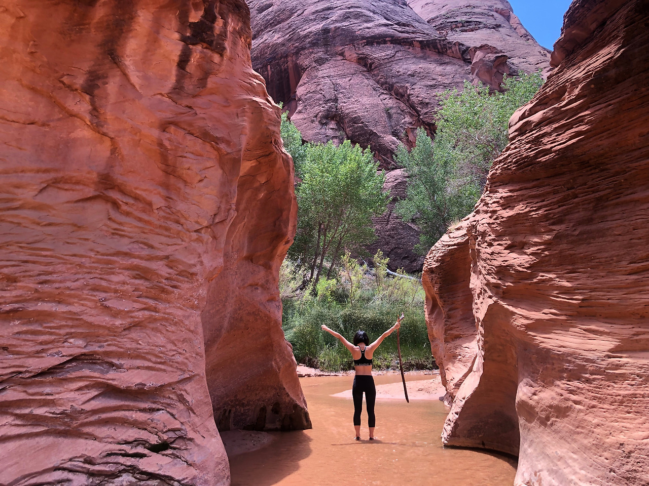 시원하다. 찰방찰방 얕은 물을 만나면 물속으로 걸었다. 걸어가면서 폭포 여러 개를 지나쳤다. 나중에 이 폭포들이 나를 위한 샤워장이 될 줄 이때는 상상도 못 했었다. 씻는 문제는 생각도 못해보고 무작정 떠난 캠핑이었다. 폭포를 지나고 암벽을 올라가고 물을 오른편에 두고 계속 걸었다. 걷다 보면 큰 암석 다리를 만나기도 하고 커다란 아치를 만나기도 한다. 그리고 강이 구불구불 흐르는 특성을 어떻게 이렇게 거대한 암석이 파악했나 싶을 정도로 물과 함께 고스란히 흐르듯 자리 잡아 있다. 그 구부러진 정도가 어느 정도인지, 얼마나 거대한지, 그리고 그게 어떻게 단 하나의 암석으로만 이루어져 있는지. 그 아무도 직접 와보기 전까지는 상상하기 힘들 것 같다. 그 거대함은 감히 카메라로는 담아지지가 않았다. 통신도 빛도 아무것도 없는 바로 이곳에 서서 그 구부러진 물줄기와 이를 따라가는 그 암석을 보고 있노라면 이 곳에 바로 자연이 주는 형용할 수 없는 무언가 있다는 생각을 지울 수 없다. 그냥 그래 자연, 자연. 이 우람한 협곡 한복판에 나 자신이 내던져 있구나.