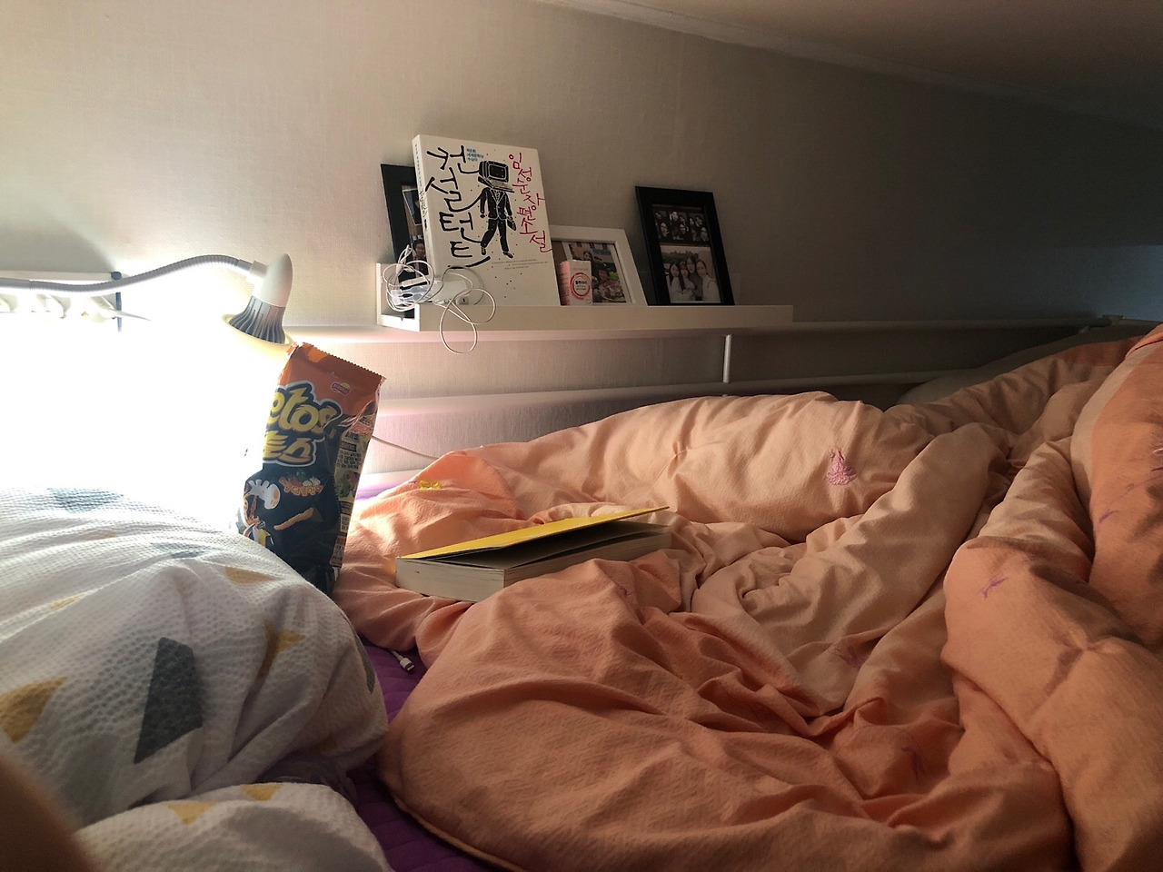 그런 와중에도 내가 가장 좋아하는 시간이 있긴 있었는데, 바로 2층 침대에 올라가 엎드리거나 누워서 책을 읽는 것이었다. 2층으로 올라가면 완전히 다른 세상 같았다. 아래가 보이지 않고 천장만이 나를 보고 있으니 그래도 나만 이 공간에 있다는 생각이 들었다. 이 공간에서 나를 짓누르던 무겁고 부정적인 감정들을 책을 통해 유하게 만들었다. 때로는 너무 부정적인 감정에 휩싸여서 책조차 쳐다보고 싶지 않을 때가 있었고, 사사건건 작가의 말에 토를 달고 싶어 질 때도 있었다. 그러면 나같이 부정적인 감정을 풀어낸 책을 찾아 읽었다. 나와 같은 감정을 느껴지는 글을 읽고 그 글 속에 빠져 한바탕 울어재끼면 속이 시원했다. 물론 그래도 아침에 출근하고 나면 여전히 같은 상황은 반복되지만, 하루 중에서 좋아하는 시간이 생겼다는 것은 나도 모르게 행복으로 다가오고 있었다. 자연스럽게 로봇병이 치유되어가고 있었던 것이다. 그저 책을 읽고 마음대로 감정표출이 가능한 공간에서 내 감정을 그대로 드러냈을 뿐인데 말이다.