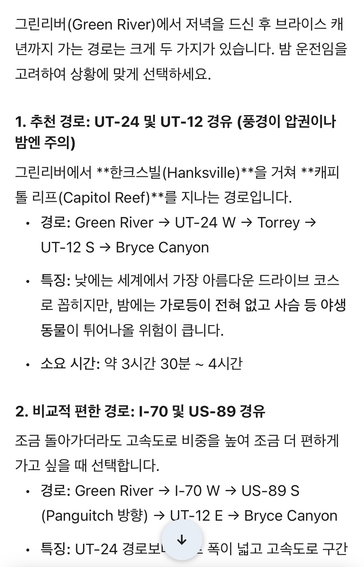 다시 브라이스 캐년을 향하는데, 제미나이의 권고, UT-12 -> UT-12 경로를 택하면 풍경이 압권이나 밤길에는 추천하지 않는다고.(그림 6) 풍경을 보고 싶지만 이미 해는 졌는 걸.