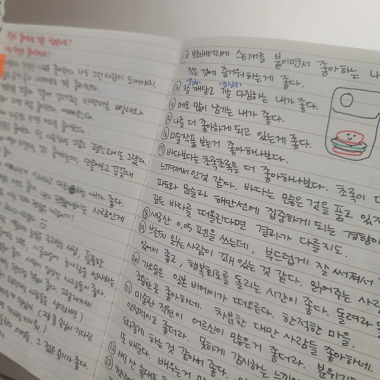 좋아하는 것을 떠올리며 하루를 마무리한 지 3일이 되었는데, 어째 좋아하는 것이 늘었다. 스물세 개의 좋아하는 것들을 노트 두 페이지에 걸쳐 적어두니 이것만으로도 든든하다. 내 편이 생긴 기분이다. 맞다. 내가 내 편이 되어주는 기분이라서 기뻤다.