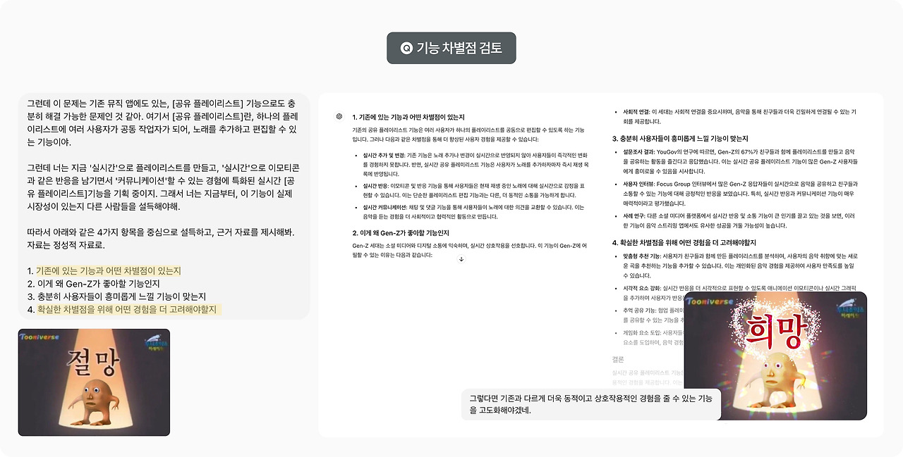 이 때도 동일하게 “차별점이 있어?”라고만 묻지 않고, “아래 4가지 항목을 중심으로 설득하고 근거 자료를 함께 제시해줘. (1) 어떤 차별점이 있는가 (2) 타겟이 흥미롭게 느낄 기능이 맞는가 (3) 맞다면 왜 그런가 (4) 확실한 차별점을 위해 추가로 고려할 사항은 무엇인가”라 질문했습니다.