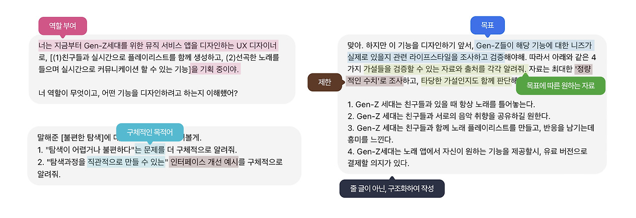 그래야 대답을 잘하더군요. 예를 들어 지난 편에서 던졌던 질문: [불편한 탐색이 구체적으로 뭐야? 해결 방안도 같이 말해줘.]처럼 두루뭉실 묻기 보단, [너가 말한 '탐색이 어렵다는' 문제를 더 구체적으로 알려줘 / 너가 말한 '문제점을 해결'할 수 있는 '인터페이스 개선 예시'를 알려줘.]식으로 질문하는 겁니다.
