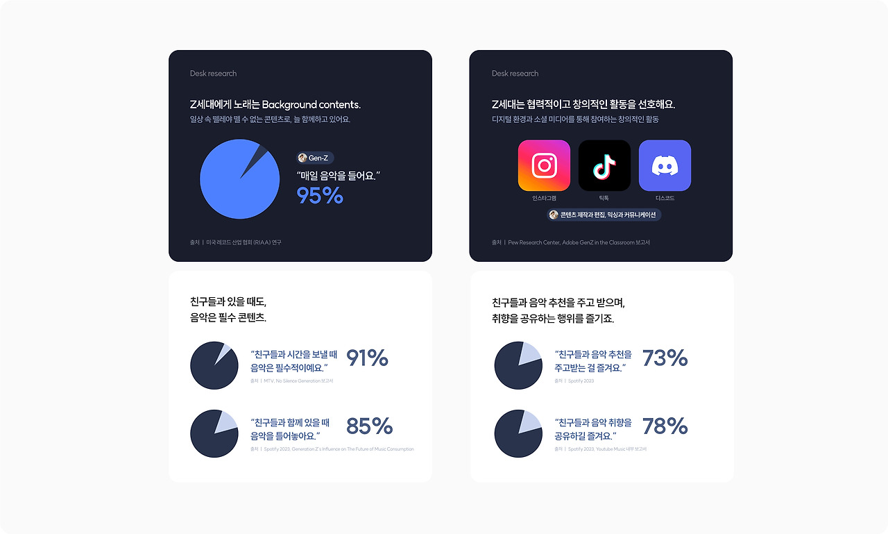 받은 자료는 꽤나 만족스러웠습니다. Spotify 리서치 자료부터 Digital Media Trend Report까지, 설정한 가설과 신뢰할 수 있는 기관의 정량적 데이터들이 잘 연결되고 있었어요.