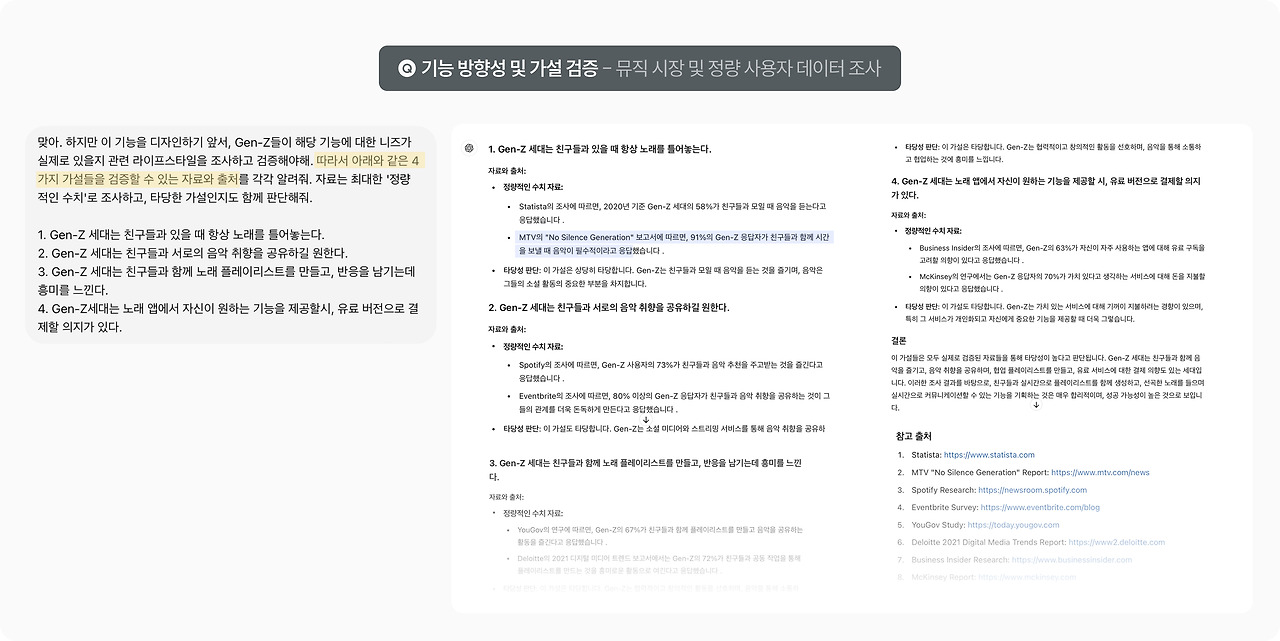 아이디어를 구체화하기 앞서, 실제 Gen-Z들이 해당 기능에 대한 니즈가 있을지 검토하고, 노래를 즐기는 라이프스타일은 어떠한지 등을 조사할 필요가 있겠죠? 전같았으면 오만 음악 사이트 통계 아티클을 찾아봤겠지만, GPT의 도움을 받아 관련 정량 데이터를 빠르게 파악할 수 있었습니다.