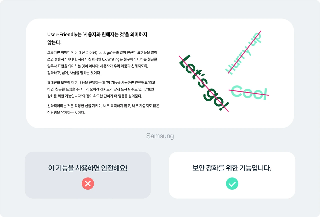 유사한 <User-Friendly> 전략이지만, 삼성은 조금 다르게 접근합니다. 삼성이 정의하는 '사용자 친화적인' 문구는 '사용자와 친해지는' 문구가 아니기에 딱딱하지 않으면서 가깝지도 않은 [적당함]을 유지하는 문구 사용을 가이드로 삼고 있습니다.