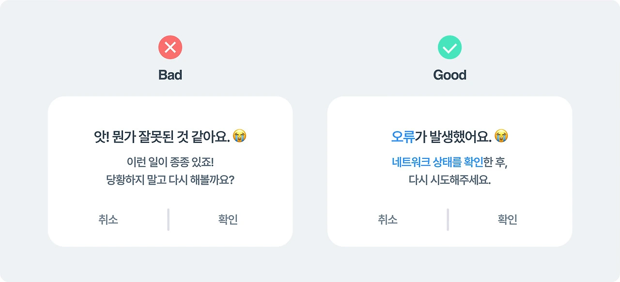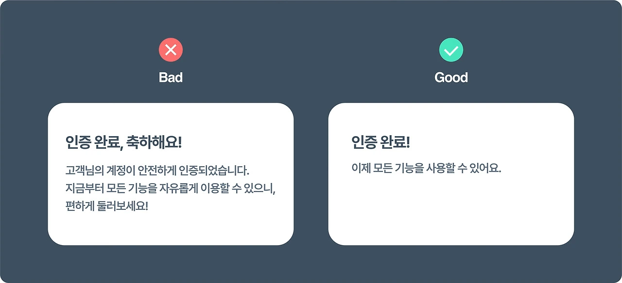 사용자에게 이 정보가 정말 필요한지, 더 짧고 명확하게 전달할 수 없는지 고민하세요. 불필요한 형용사와 장황한 부연설명은 사용자의 인지 부담을 높이고, 사용성을 떨어뜨립니다. 명확하지 않은 표현은 사용자를 불안하게 만들고요.
