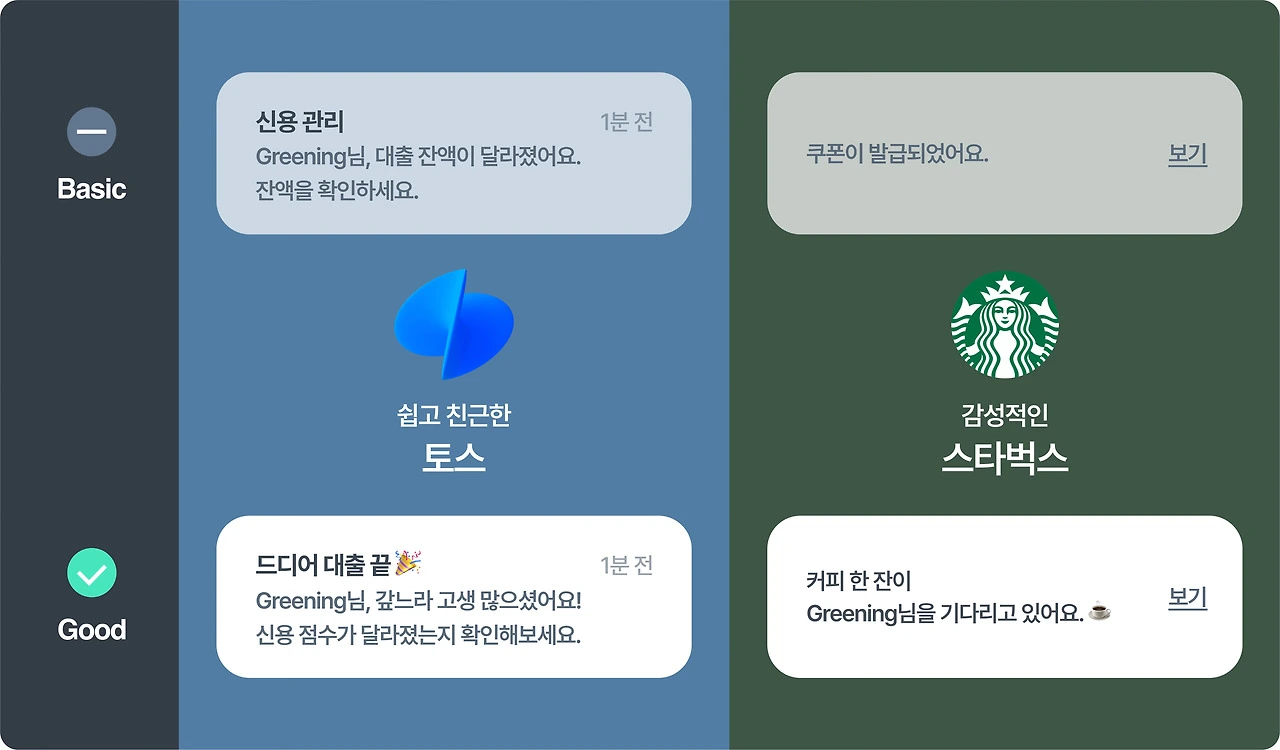 UX 라이팅은 단순히 기능을 설명하는 것만이 아니라 브랜드의 개성을 표현하는 도구이기도 합니다. 같은 기능이더라도 어떤 브랜드는 친근하게, 어떤 브랜드는 전문적으로 전달하죠. 이처럼 UX 라이팅에 브랜드의 아이덴티티가 잘 녹여지면, 사용자는 해당 기업의 고유한 톤앤매너를 느끼고 더 친숙하게 받아들일 수 있어요.