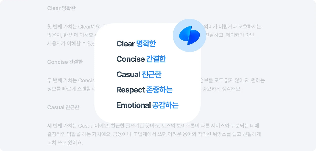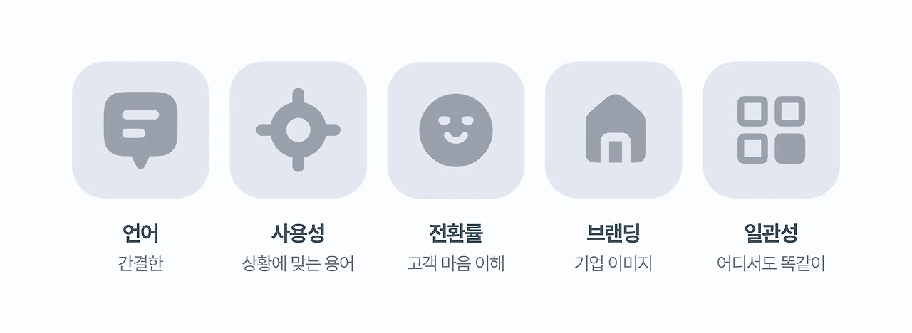 UX 라이팅(User eXperience Writing)은 사용자 경험을 기반으로 한 글쓰기로, 서비스의 사용성을 높이고 브랜드 경험을 최적화하는 작업입니다. 전통적인 카피라이팅이 제품을 구매하도록 설득하거나 홍보하는 데 초점을 맞춘다면, UX 라이팅은 제품과 사용자가 원활하게 상호작용(Interaction)할 수 있도록 돕는 것이 핵심이죠. 좋은 UX 라이팅은 다음 다섯 가지 요소가 조화롭게 갖춰졌을 때 읽기 쉽고, 호감이 가며, 사용자에게 편안한 경험을 제공합니다.