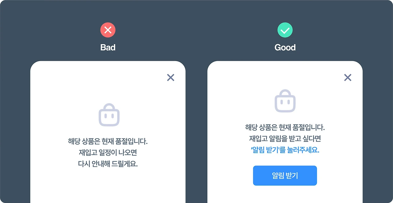 구매하고 싶어 찾아본 상품이 품절 상태라면? '그럼 언제 다시 살 수 있는지'가 궁금할 수밖에 없겠죠. 재입고 일정을 정확히 안내할 수 없다면 사용자의 How(나는 어떻게 해야하는지) 경험을 높일 수 있는 정보와 취할 수 있는 액션을 추가해야 합니다. 왼쪽은 [언제 나올지도 모르는 일정을 무기한으로 기다린다]의 How인 반면, 오른쪽은 [당장은 알림 받기 버튼을 눌러 해결, 재입고가 되면 즉시 알림을 받고 확인할 수 있다]이니 훨씬 유용하죠.