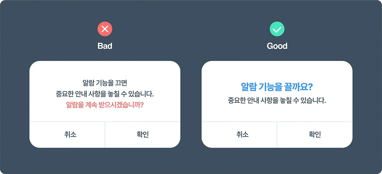왼쪽의 케이스는 알람을 끄려는 사용자의 의도를 무시하고, 팝업 내용을 반대로 안내합니다. 사용자는 '취소'를 눌러야 하는지, '확인'을 눌러야 하는지 헷갈리기 시작하고, 불필요한 고민 시간을 갖게 되죠.