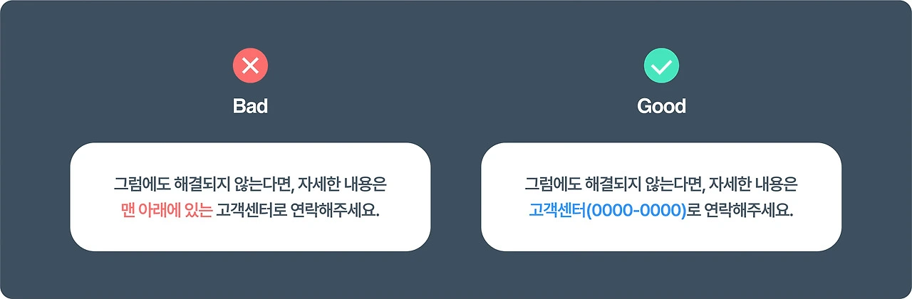 특히 '맨 아래'라는 표현은 화면이나 페이지의 기준이 불명확하고, 사용자가 직접 스크롤을 내려 연락처를 찾아야 하는 번거로움을 만듭니다. 따라서 사용자가 도움을 얻기 위한 추가적인 노력을 들이지 않도록, 필요한 정보를 바로 제공하는 것이 더 명확한 UX 라이팅이에요.
