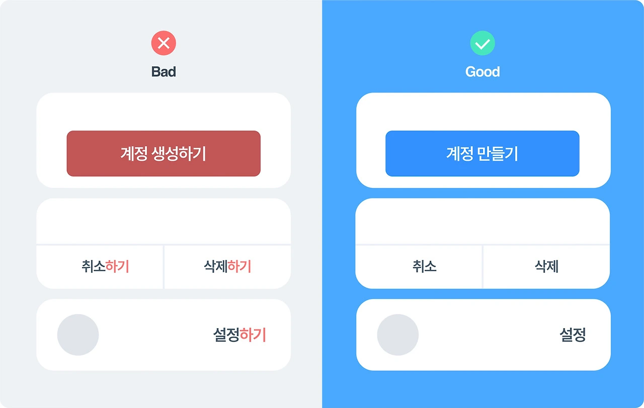 오히려 계정 생성하기보다는 [계정 만들기]나 [시작하기]가 더 간결하고 직관적인 문구가 될 수 있습니다. 뿐만 아니라 취소하기, 삭제하기, 설정하기, 알람 설정하기.. '-기'가 제외되거나 다른 동사로 표현되는 쪽이 더 맞는 표현일 때가 많고요. 따라서 [-하기] 문구를 작성할 때는 되려 문구가 불필요하게 길어지고 있지는 않은지, 불필요한 표현은 아닌지 꼭 점검해 보세요.