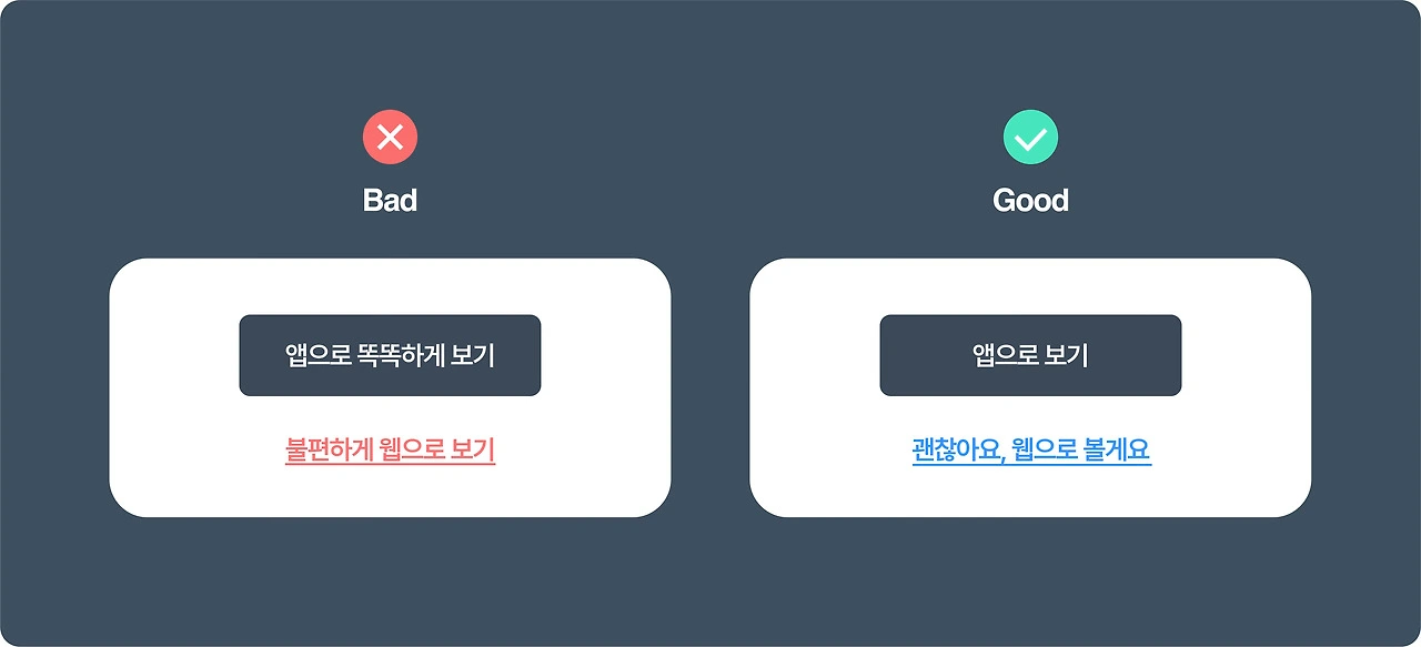 요새 웹으로 앱을 이용할 때 종종 마주하는 문구인데요, '불편하게 보기'라는 표현은 사용자의 선택을 깎아내리고 '내가 멍청해진 듯한' 심리적 부담을 조성하기 때문에 꽤나 열받는 다크 패턴입니다. 따라서 오른쪽처럼 사용자의 선택을 존중하는 중립적인 표현을 사용하고, 특정 선택이 더 나은 것처럼 유도하지 않아야 합니다.