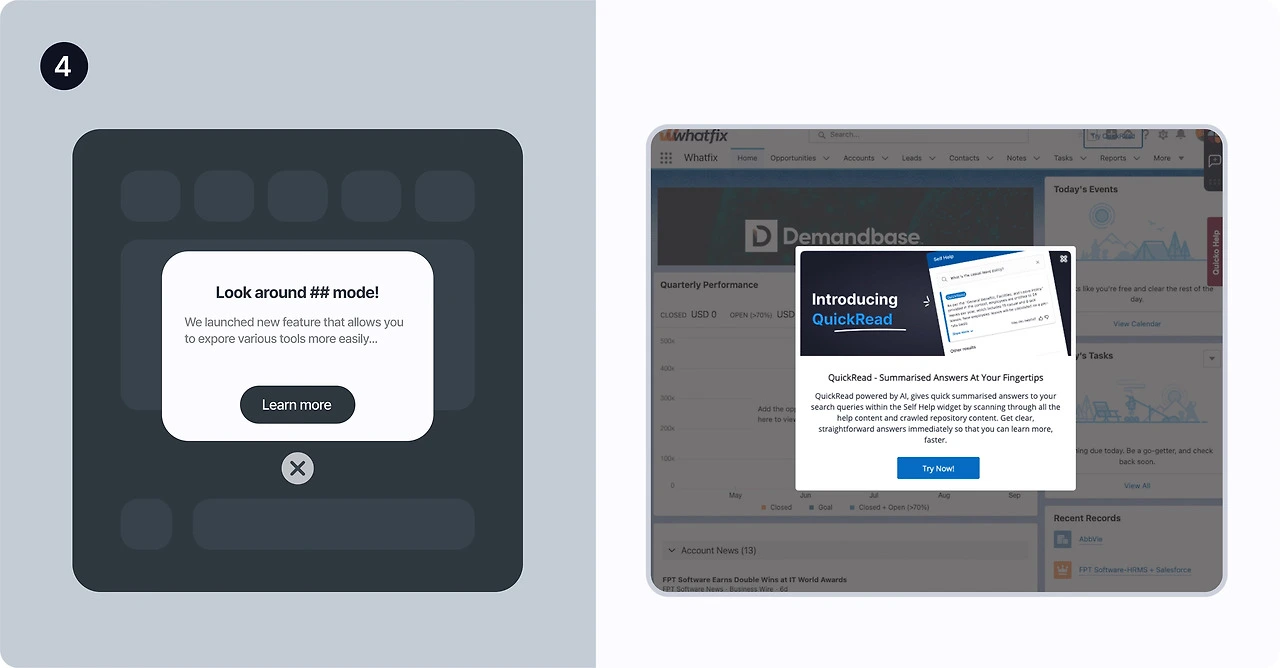 기능을 실제 사용할 때마다 해당 시점에 필요한 정보만 단계적으로 제공하는 방식입니다. 맥락 중심의 안내를 통해 자연스럽게 학습을 유도하며, 복잡한 기능을 가진 서비스에서 특히 효과적입니다.