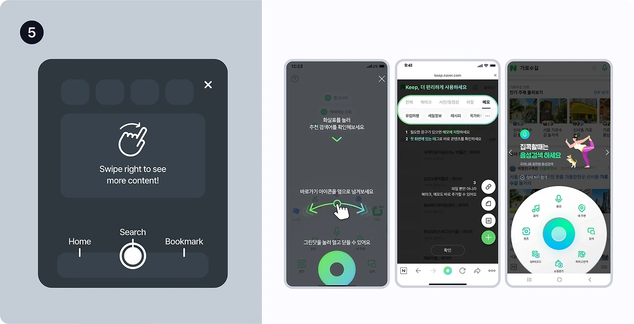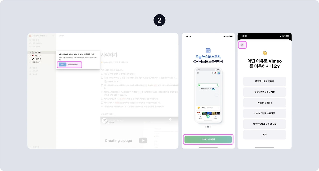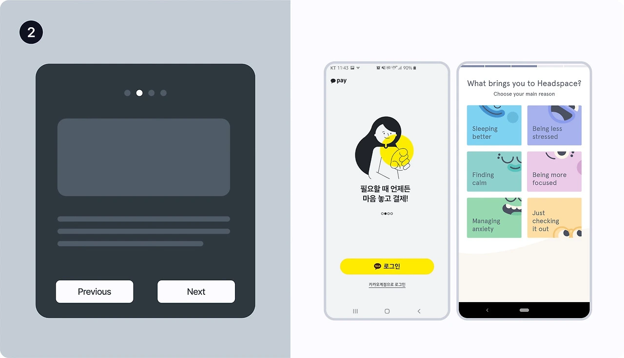 앱이나 서비스의 핵심 기능을 단계별로 소개하는 방식입니다. 보통 스크린별로 핵심 기능을 보여주며, 좌우 스와이프나 다음 버튼을 통해 진행됩니다. 앱을 깔았을 때 처음 등장하는 튜토리얼 가이드, 사용자 취향 선택 페이지들이 이에 해당합니다.