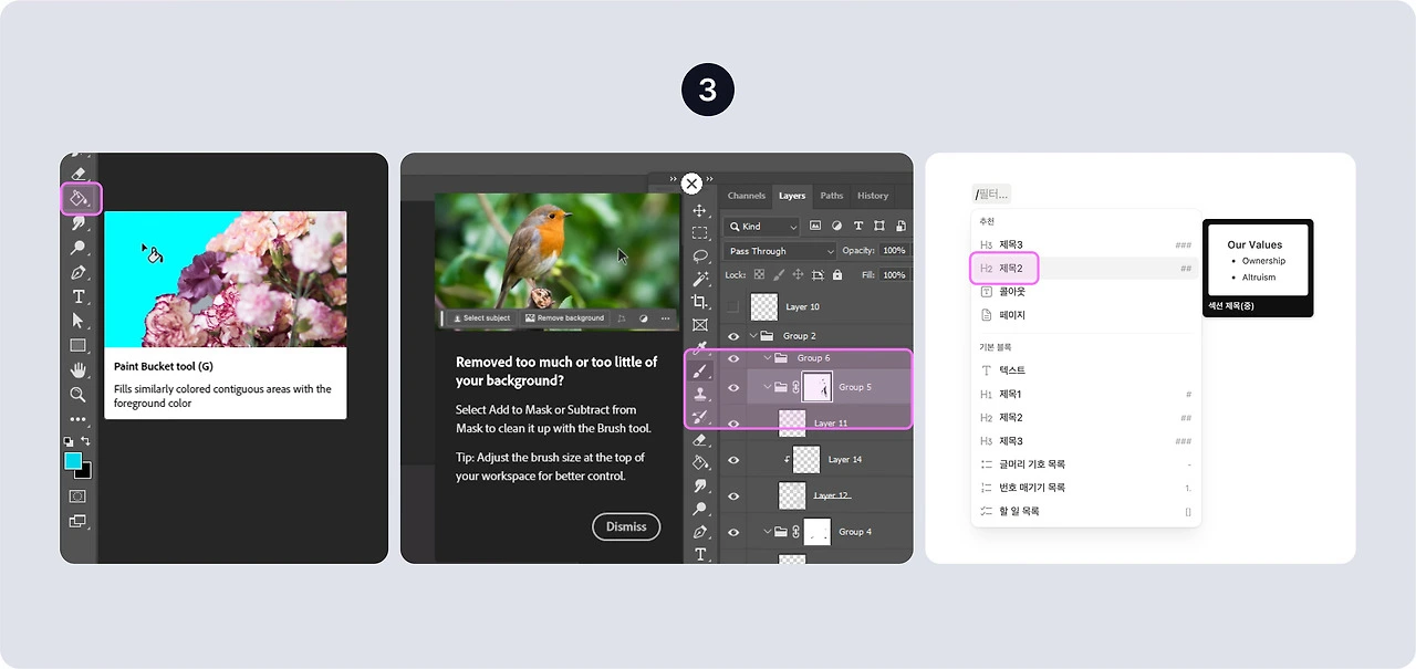 어도비 & 노션: 도구 위에 마우스를 올리면 해당 기능의 설명이 툴팁이나 팝업으로 안내